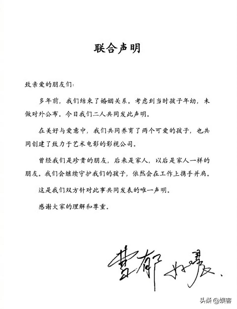 刚刚,姚晨和曹郁发布联合声明官宣离婚:“多年前,我们结束了婚姻关系,考虑到当时孩子年幼,未做对外公布”,“曾经我们是珍贵的朋友,后来是家人,以后是家人一样的朋友。”据悉,两人2011年同返住所,恋情曝光,次年,两人在新西兰举行婚礼,婚后育有一儿一女。姚晨之前与大学同学凌潇肃有过一段婚姻,当年离婚引起骂战,如今二婚也离婚了!姚晨 凌潇肃 曹郁