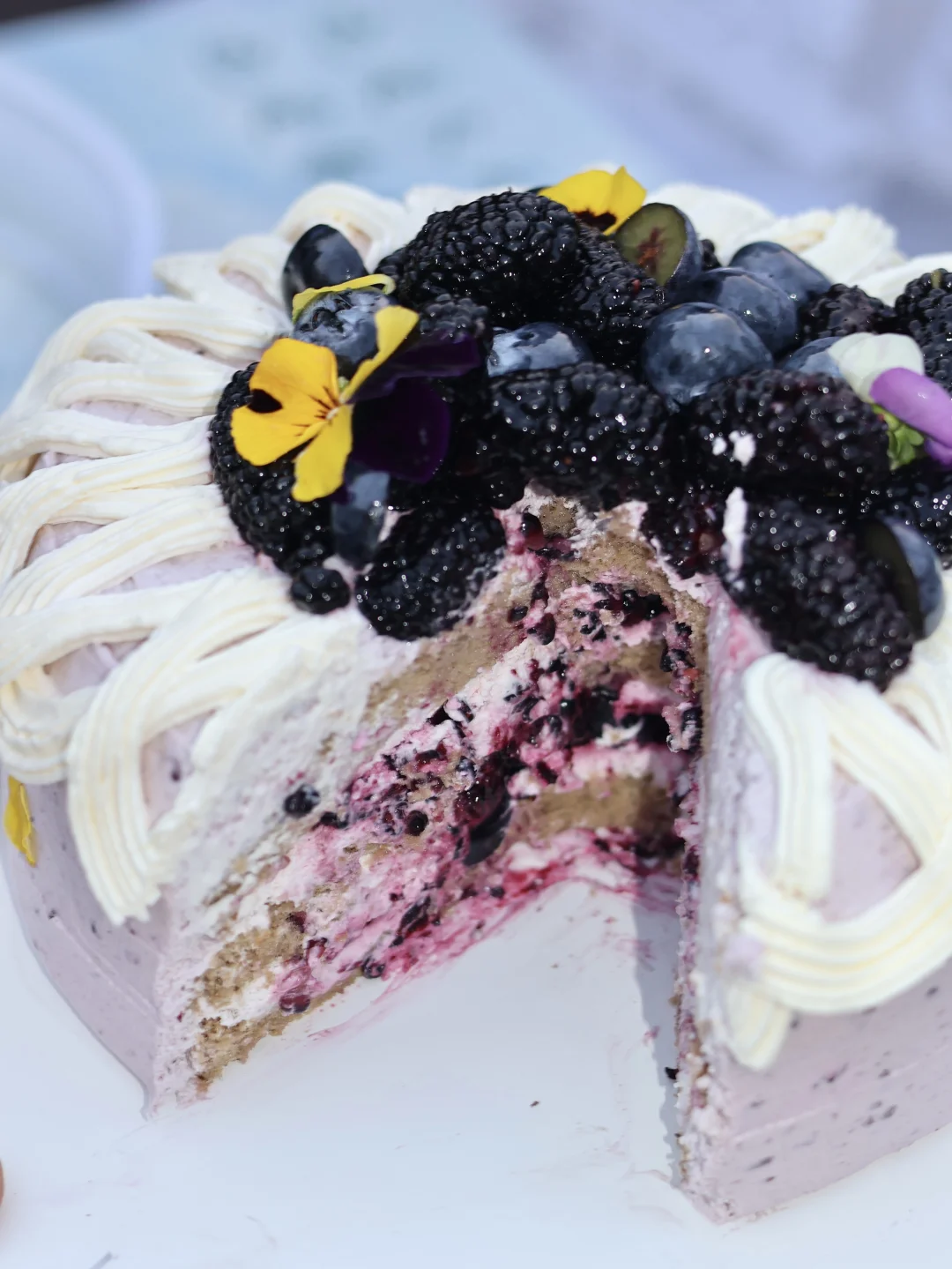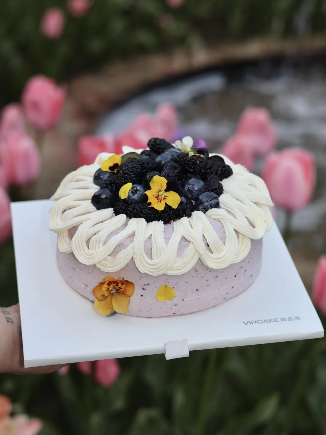 一个懒洋洋的春日午后~ 蛋糕和阳光与我做伴…☀️ 唯品客de春野双莓 🫐➕桑葚 酸甜交织 轻盈清爽🍃 手工熬的蓝莓桑葚酱 果肉清晰可见.. 酸奶奶油里加了巴西莓粉🌸 粉粉嫩嫩的超春天! 口感清爽不腻 和下面的原味动物奶油一搭更有层次了! 祁门红茶戚风胚吸饱了莓果汁水 就像郁金香花田拂过的温柔晚风🌷🌷🌷 每一口都是春日阳光的碎片🧩