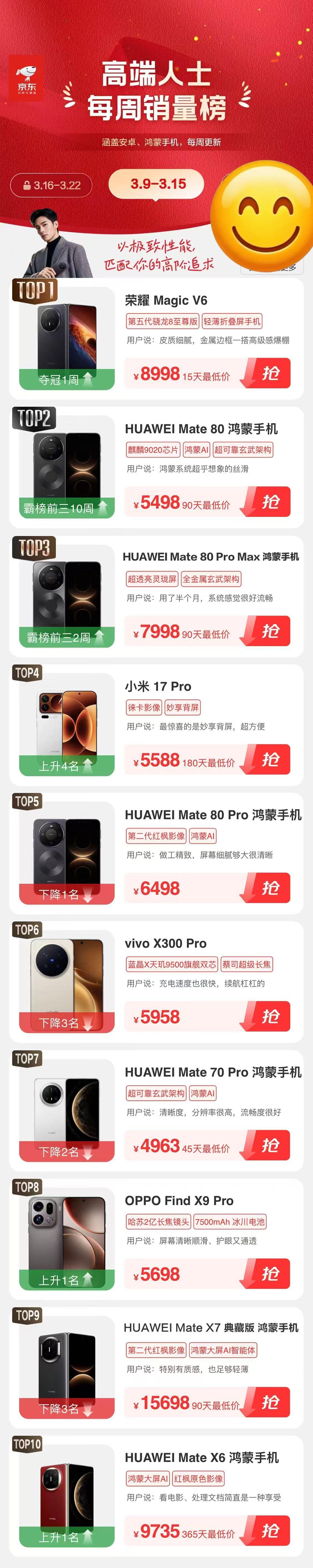 8998的价位,荣耀Magic V6真的把同价位的高端旗舰卷到没话说。 看京东3.9-3.15的高端人士销量榜就懂,它直接拿下TOP1,还是TOP10里唯一的折叠屏,同价位的直板旗舰全被它甩在了身后。它没有为了折叠形态牺牲任何旗舰配置,第五代骁龙8至尊版、顶级屏幕、旗舰级通信续航全拉满,还做到了行业顶尖的轻薄手感。同价位想要折叠屏的新形态,又要不输直板的综合体验,Magic V6就是唯一最优解。