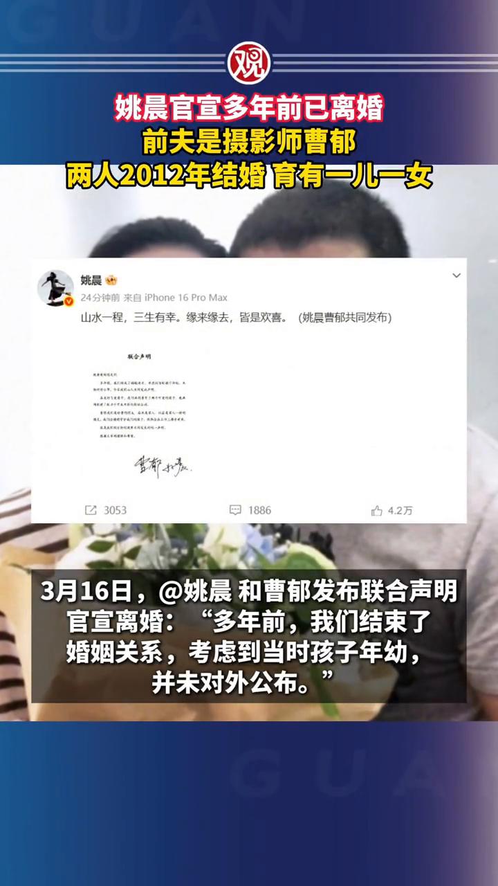 姚晨官宣多年前已离婚,前夫是摄影师曹郁,两人2012年结婚育有一儿一女。 3月16日,@姚晨和曹郁发布联合声明官宣离婚:"多年前,我们结束了婚姻关系,考虑到当时孩子年幼,并未对外公布。"据悉,两人2011年同返住所,恋情曝光,次年,两人在新西兰举行婚礼,婚后育有一儿一女。