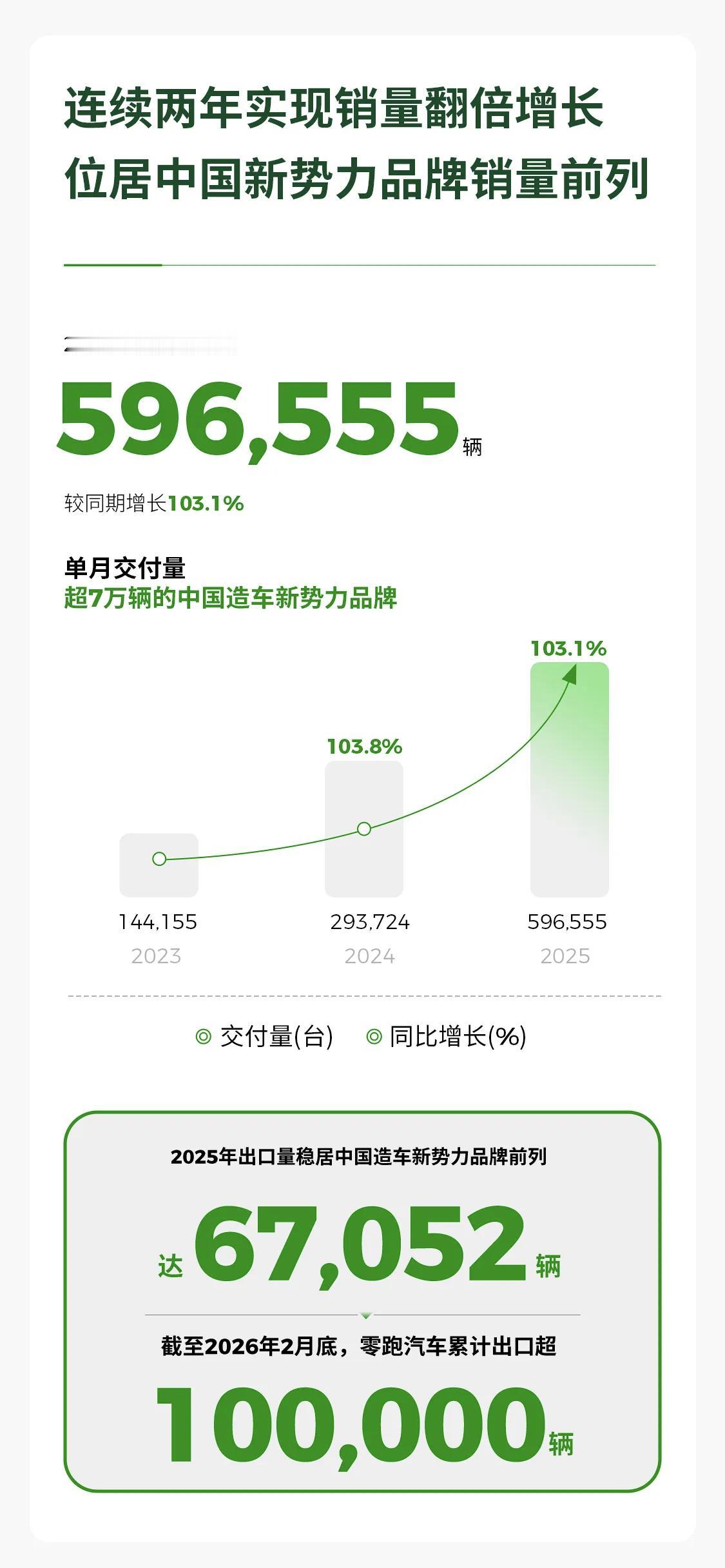 想看懂一家新势力车企的真实水平,看它的财报就知道了。最近零跑汽车交出2025年最新财报:全年交付596,555台,勇登顶新势力年度销冠;海外交付超6.7万台,位列新势力出口第一。