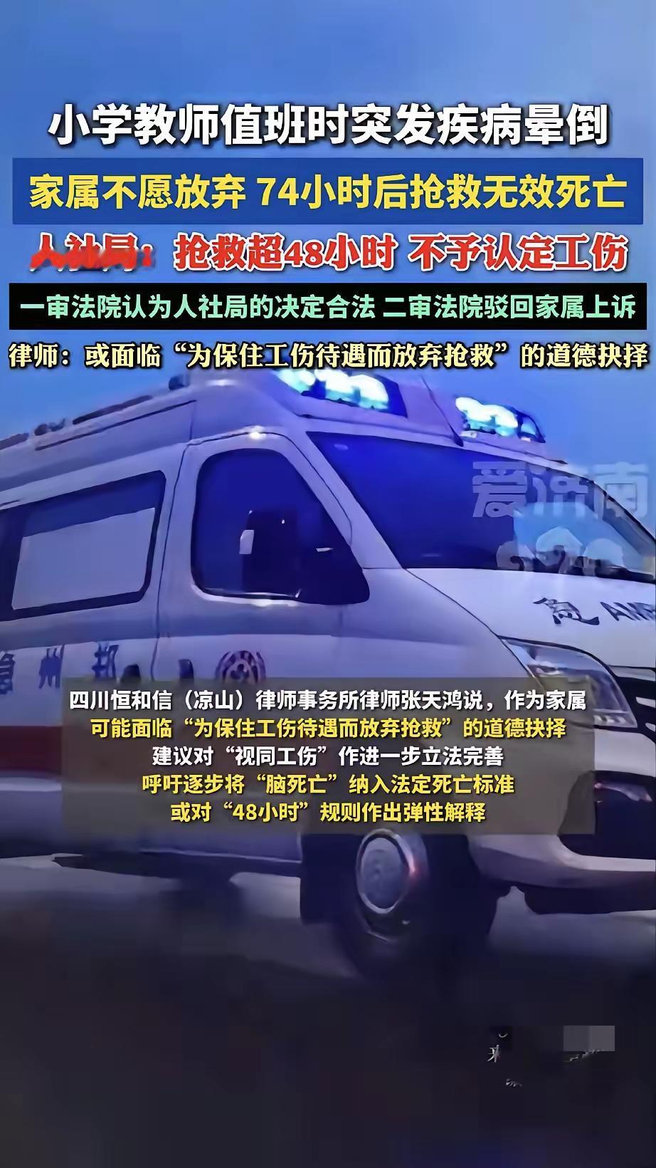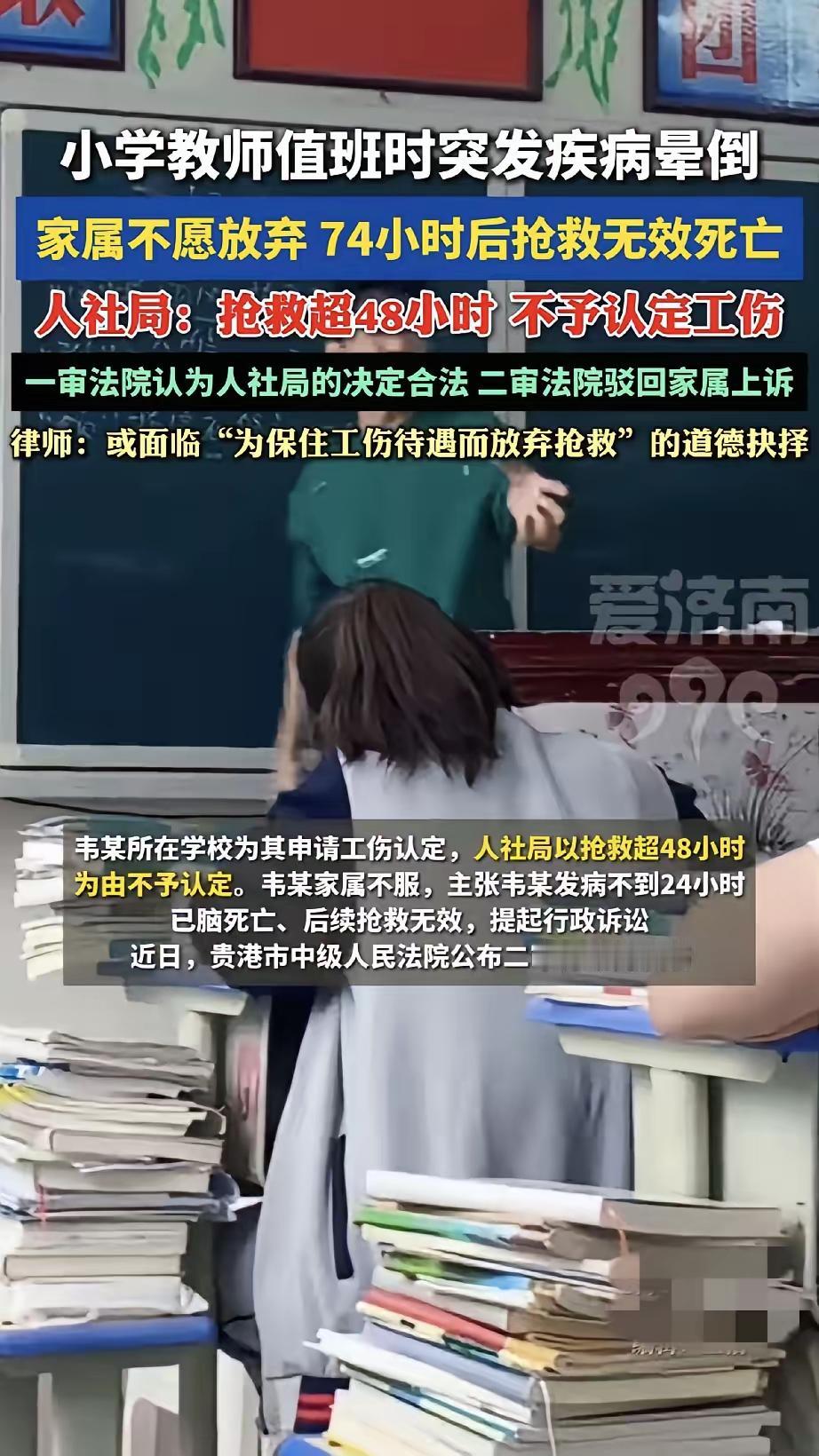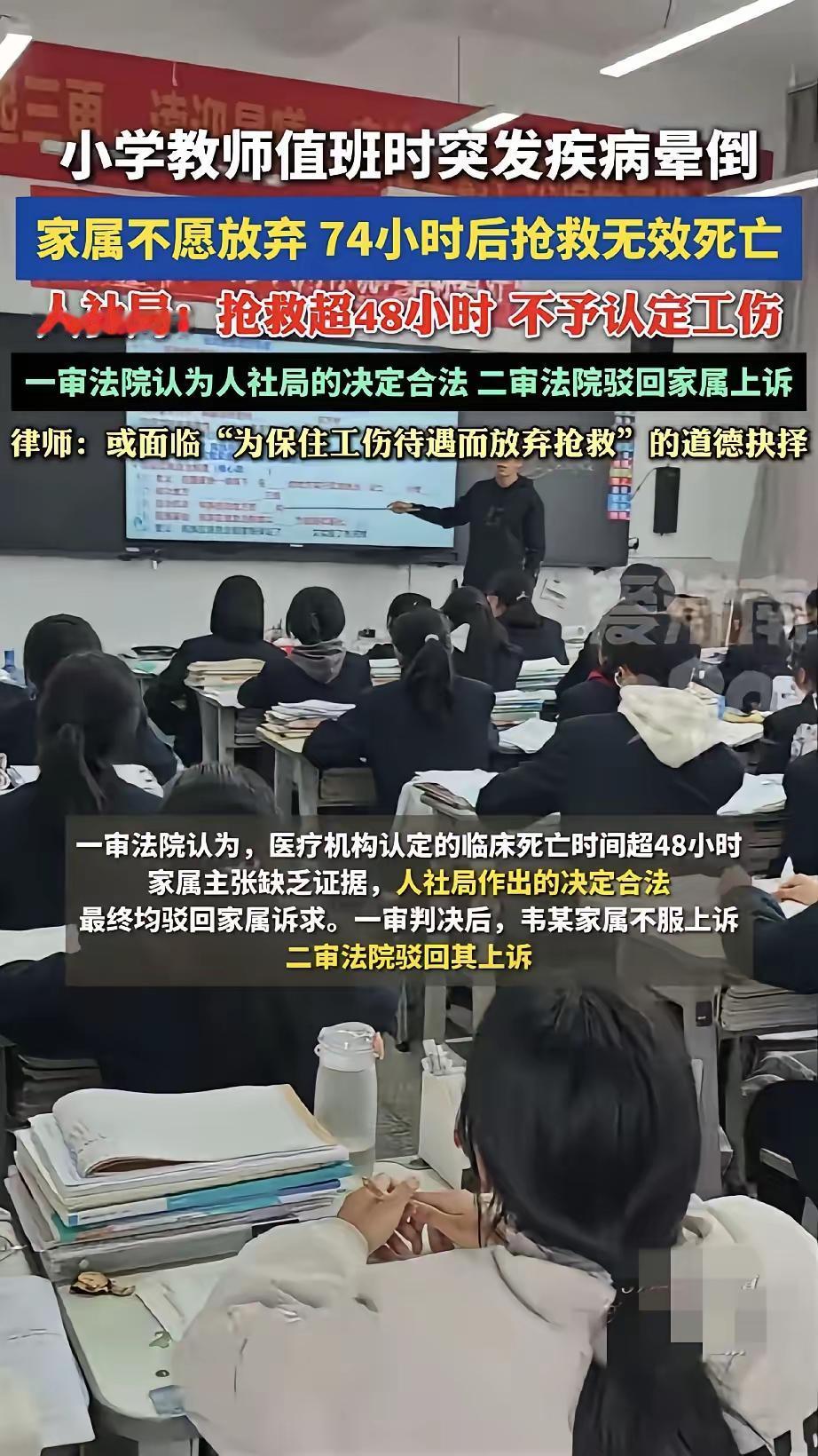 小学老师值班时突发疾病晕倒,术后74小时离世,人社局法院不支持工伤!真相太扎心了!一位小学老师在值班时突发疾病晕倒,手术后情况一直不好,家属不忍心放弃,拼尽全力抢救,可最终还是没能留住他脆弱的生命,74小时后不幸离世。 学校很负责,主动帮他申请了工伤,可人社局依据规定,以抢救超过48小时为由驳回了申请。 家属心里难过,不甘心,人财两空,起诉到法院,一审、二审都没有支持工伤认定。 从法律上讲,《工伤保险条例》里“48小时内死亡”确实是硬性标准,人社部门和法院按条文办事,程序上没有错。 可站在人情与现实的角度,真的太让人心寒了。 但凡还有一丝希望,哪个家属会选择放弃治疗? 为了救人,谁会去算计时间够不够48小时? 最后往往是人没了,钱也花光了,连最基本的工伤保障都拿不到。 这条冰冷的时间线,守住了规则,却没能护住一个尽职的老师和他悲痛的家人。 法理之外,更该有人情,希望这样的遗憾能少一点。 也奉劝所有老师,身体出了状况,一定要去医院治疗。 爱自己,不仅仅是为了自己,而且是为了你的整个家庭。 毕竟一个班级缺了你,还有别的老师去顶替,但是一个家庭缺了你,谁也顶替不了啊! 教师病亡