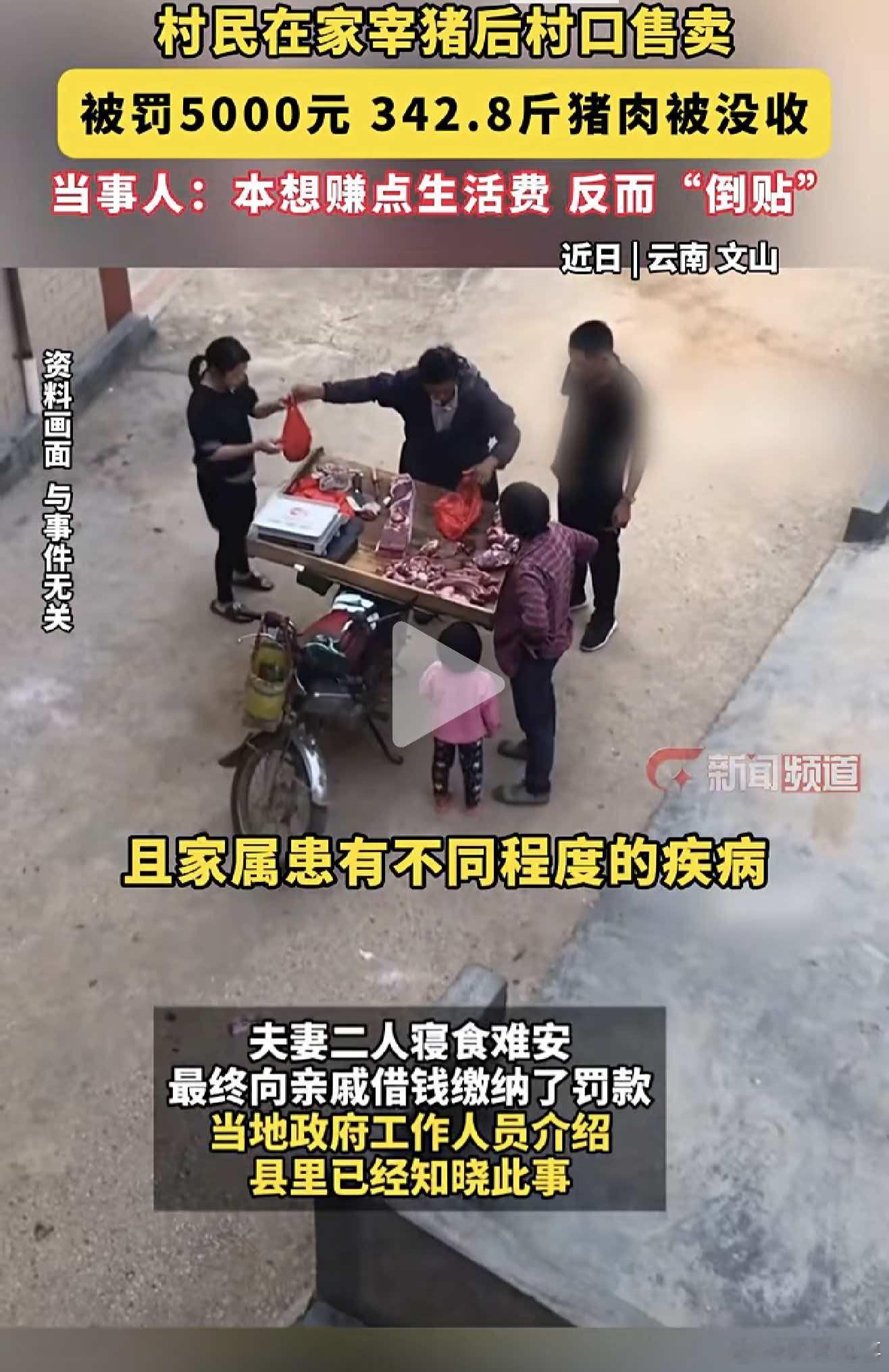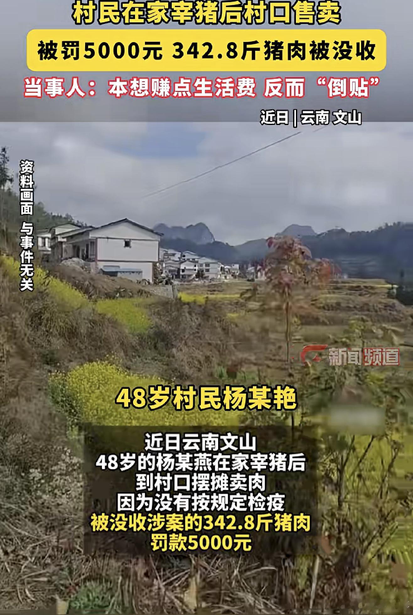 农民卖猪被罚5000元 近日,云南砚山县村民杨某艳,花费2960元购买生猪,在家私自屠宰生猪后拉到村口售卖,因未检疫被市场监管部门查处。342.8斤猪肉尚未卖出就被没收,同时被罚款5000元。杨某艳称自己是文盲,不懂相关规定,且家庭困难,丈夫体弱,小儿子患有先天性心脏病。夫妻二人为此事寝食难安,但,已向亲戚借钱缴纳罚款。
