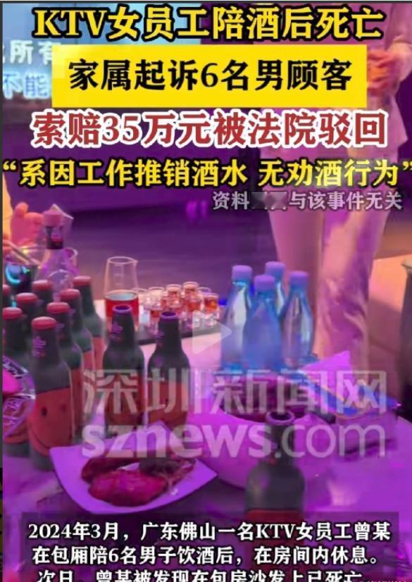 广东佛山,有个KTV女员工进包厢给6名男顾客推销酒水,礼貌性喝了几口后在包厢休息。 第二天,人没了。家属把一起喝酒的6名男顾客告了,要求赔偿35万。但法院最后没支持家属的诉求。为啥? 事情发生在今年3月。女员工曾某去包厢推销酒水,陪客人喝了几口,之后就坐在包厢里休息。到了凌晨一点多,那6名男顾客酒局散了,就各自回家了。当时曾某还在包厢里。 凌晨两点半,保洁员来打扫,看到曾某在沙发上哭,但没多管,以为就是喝多了情绪不好。结果到了下午五点多,才发现曾某已经死在了包厢沙发上。 家属认为,一起喝酒的6个人有责任,没尽到照顾义务,把人丢下不管,所以告上法庭索赔。 但法院审理后发现,事情不是这样。这6个人只是来消费的顾客,和曾某是服务员与客人的关系。 他们并没有主动劝酒、灌酒,离开的时候,也不知道曾某会有生命危险。从法律上讲,他们之间不存在法定的照顾义务。 所以法院驳回了家属的诉求。这个判决,情理上可能让人难受,但法理上是站得住脚的。顾客来消费,没有义务去照看服务员。这就像你去饭馆吃饭,不需要负责照看厨师和服务员的健康一样。 那责任在谁呢?有网友说得对,KTV作为用人单位,员工在工作时间、工作场所发生意外,更可能涉及工伤认定的问题。还有当晚发现她哭的保洁员,如果能多一点关心,或许能避免悲剧。 这件事挺让人唏嘘的。一个年轻的生命就这样没了。它也提醒我们,喝酒一定要量力而行,自己要对自身安全负责。同时,身边的人如果状态明显不对,多问一句,多帮一把,也许就能避免不幸。