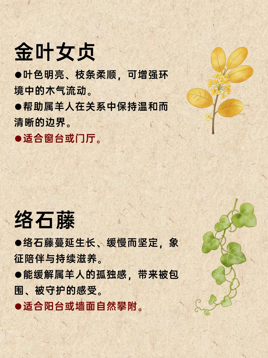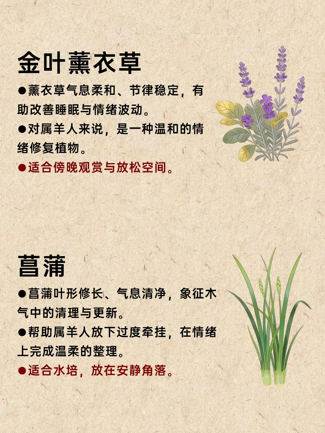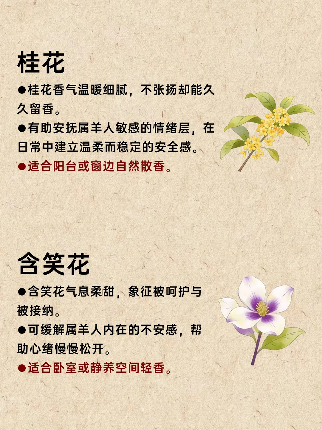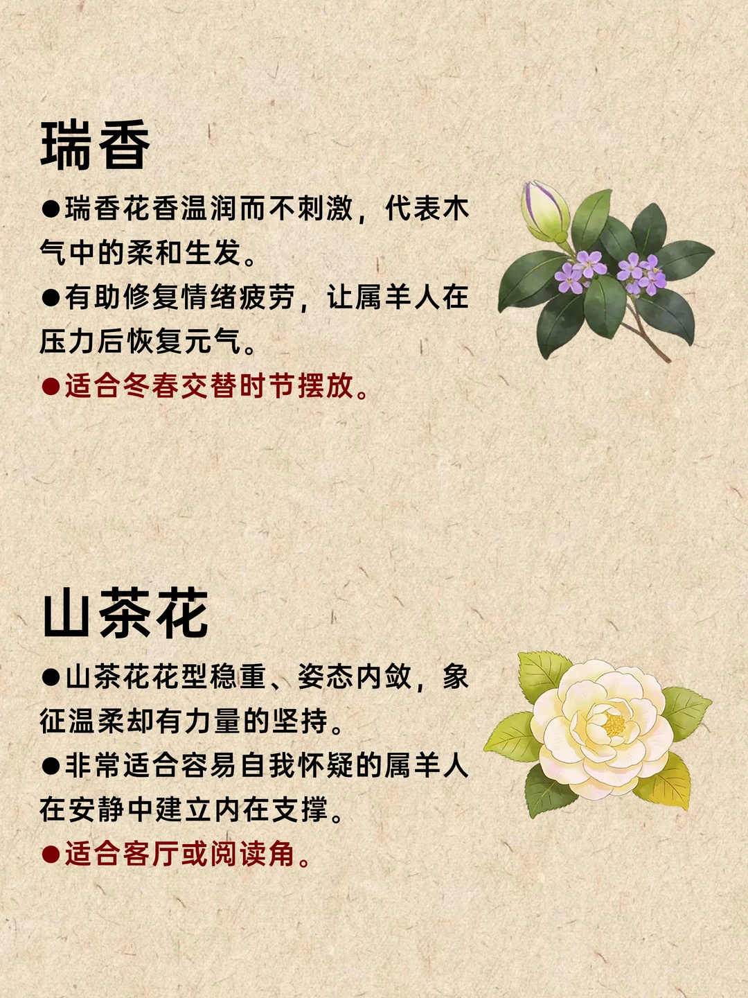 属羊之人多温柔细腻、情绪感知强; “木”代表滋养、生长与内在的柔韧力量。 当木气充足,属羊的人更有安全感,也更能在温和中稳定前行。 适合喜木属羊的 10 款植物: 桂花、含笑花、瑞香、山茶花、金叶女贞、络石藤、香蜂草、紫苏、金叶薰衣草、菖蒲。 这些植物带来的不是锋芒,而是持续的滋养。 选一株与你气场契合的,让生活慢慢变得安心而顺畅。 用香气触碰情绪 芳香疗法 香薰 香文化 天然香薰 生肖 五行能量 喜木 净化磁场与能量 属羊