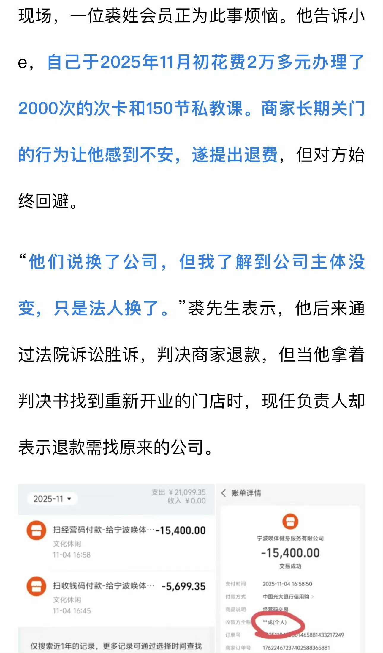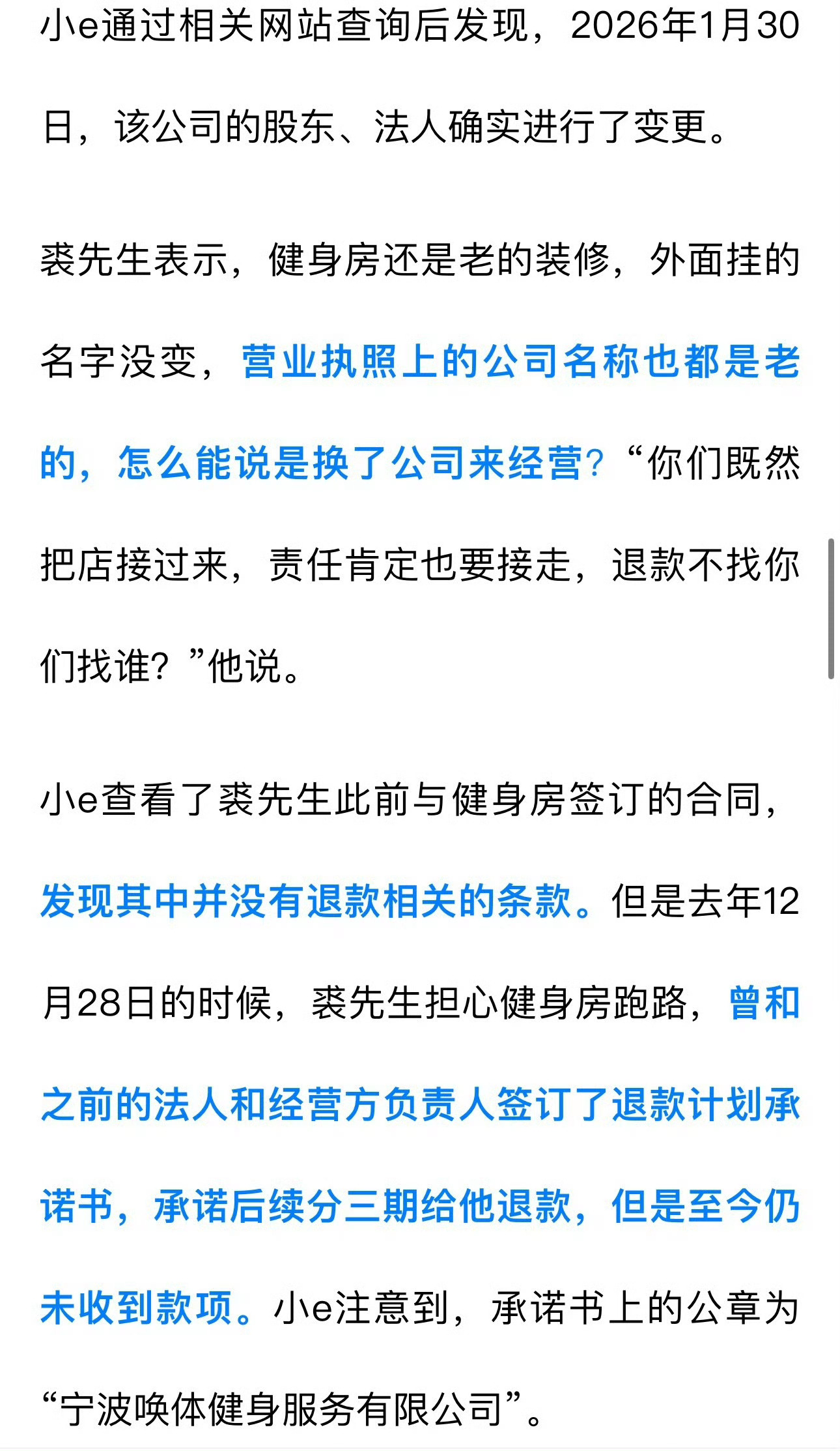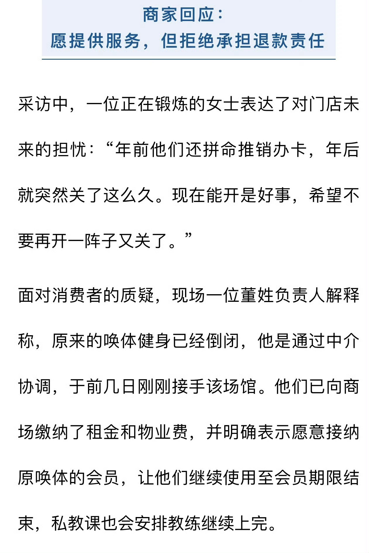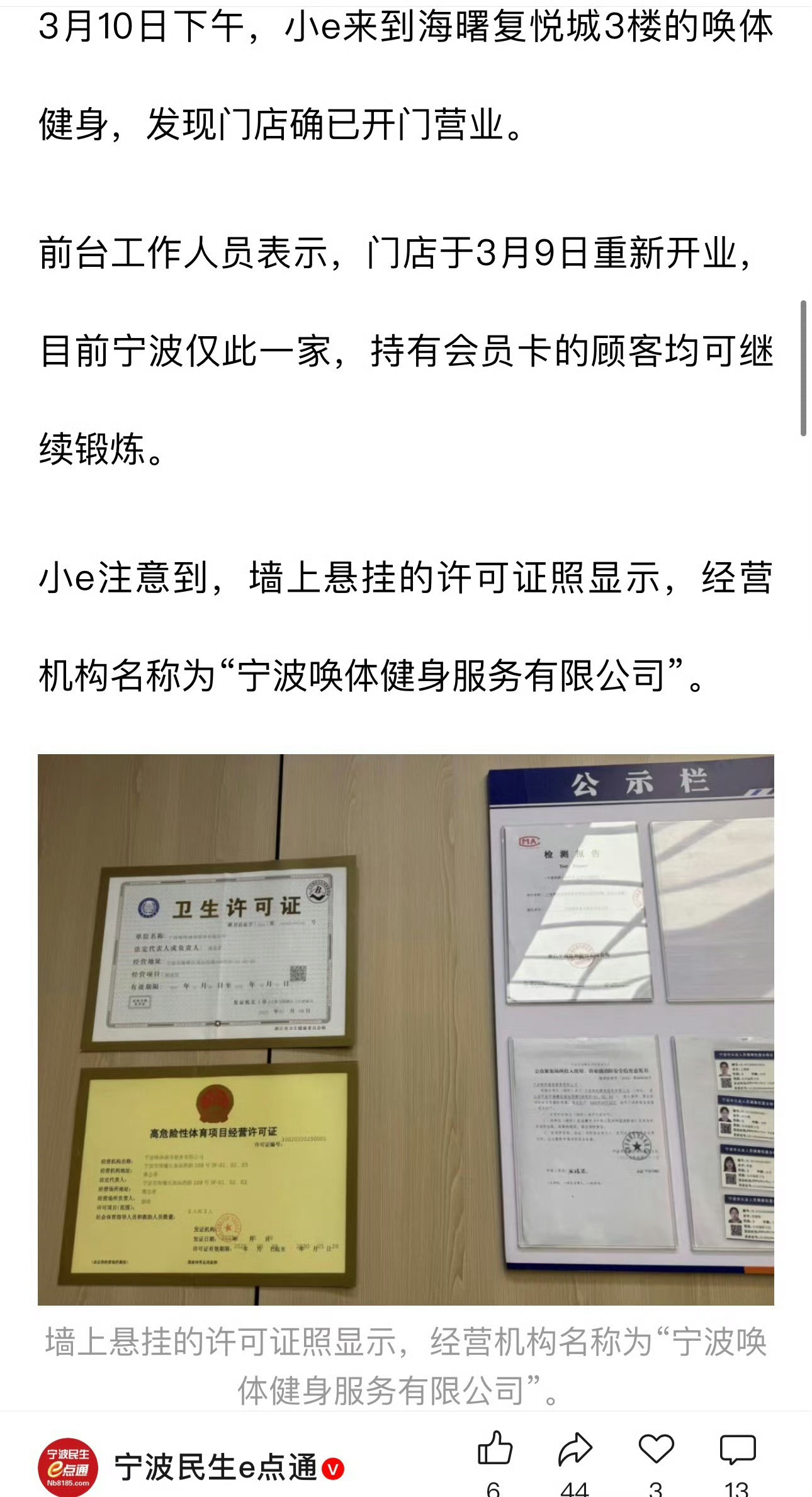 宁波海曙复悦城一健身房频繁停业退费难 办了卡就关门?健身房频繁停业,退费难何解?近日,多位网友通过宁波民生e点通群众留言板反映,位于海曙复悦城的唤体健身自2026年1月起便以各种理由频繁关闭,直至年后彻底停业,让消费者陷入维权困境。不过,当小e于3月10日前去探访时,这家健身房已经恢复营业。然而鉴于店家的营业状况,一些会员仍继续提出退款要求,店家未允许。那么消费者这样的要求合理吗?