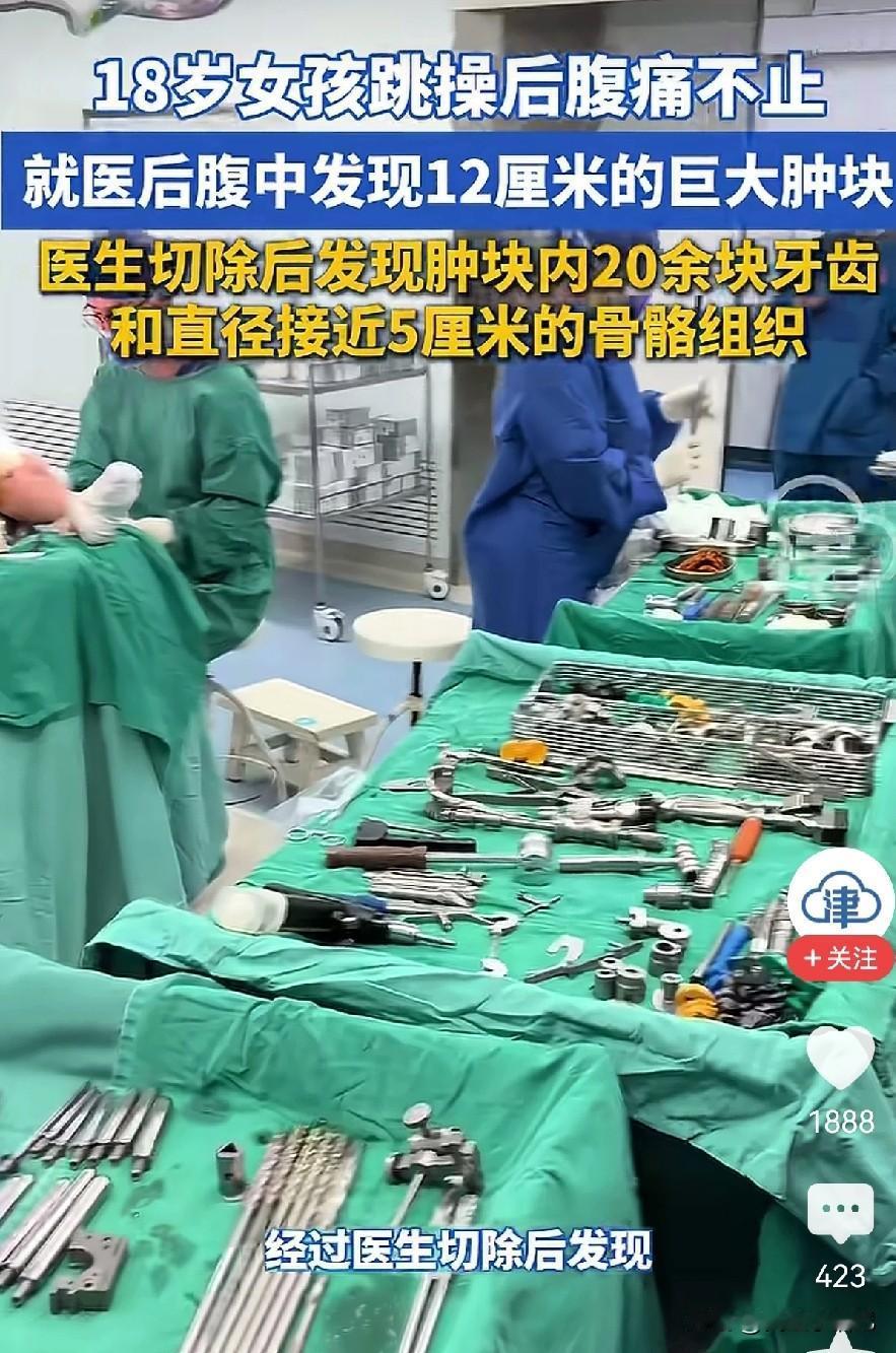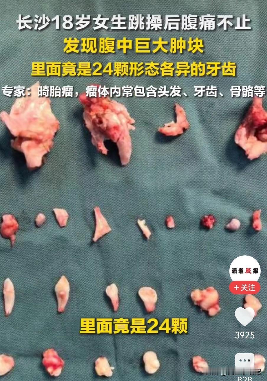 18岁女孩跳操突然腹痛,医生竟从肚子里取出“牙齿”!这20多颗牙齿到底哪来的? 近日,长沙发生了一件让人匪夷所思的事。一名18岁的女孩在家跟着网上视频跳操,跳着跳着突然腹痛不止,疼得直不起腰,家人赶紧把她送往医院。 经过检查,医生在她腹中发现了一个直径约12厘米的巨大肿块。 更让人惊讶的是,肿块里竟然藏着20多颗形态完整的牙齿,还有一些骨骼样结构。 医生解释,这属于卵巢成熟畸胎瘤,是一种常见的良性肿瘤。因为肿瘤里含有毛发、油脂、骨骼甚至牙齿等组织,所以才会出现这种“身体里长牙齿”的情况。 医生也特意提醒,年轻女性如果出现不明原因的腹痛、下腹坠胀等不适,一定要及时就医,千万别硬拖。 关注健康,事事有惊喜!大家怎么看这种奇特病例? (图片来自网络视频)