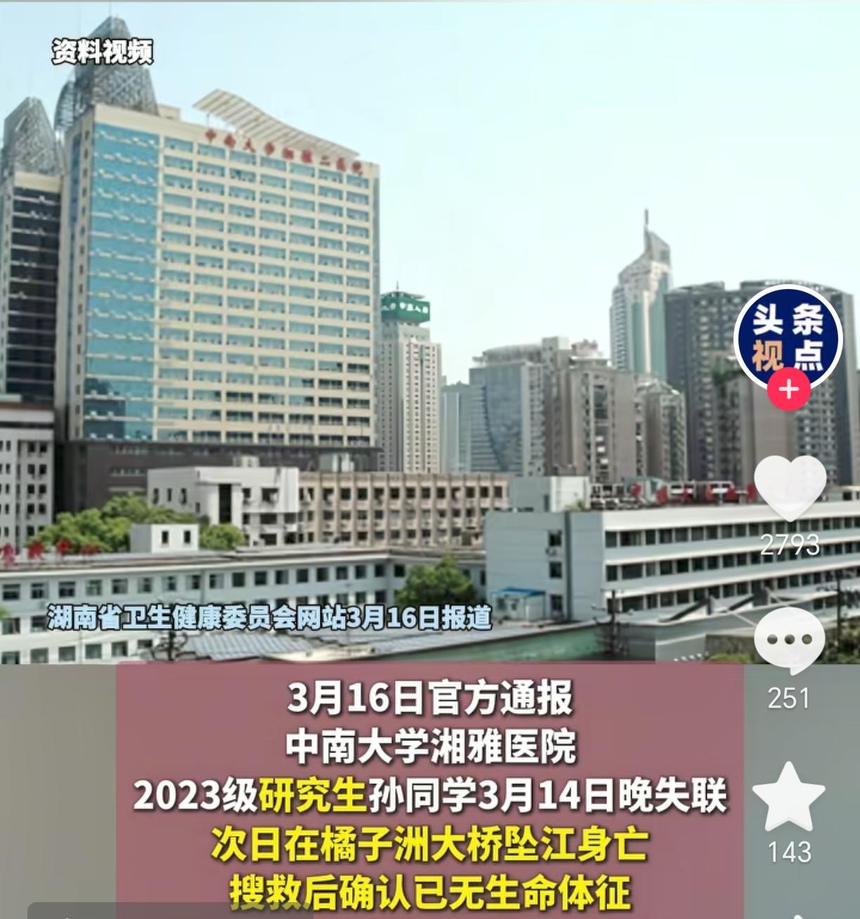 中南大学湘雅医院,一个叫孙某的2023级研究生坠江身亡引爆网络 最让人心碎的,是她留下的那封告别信。信里写着:“我此生最后悔的事情,就是保研选择湘雅,选择这个导师。”她说,不是因为临床压力,也不是因为家里的事,她只是想“作为一个正常人死去”。 一个花季女孩,顶尖医学院的研究生,未来的医生,就这样走了。从她离开宿舍到坠江,只有90分钟。事情发生在3月14号晚上。第二天下午,遗体被打捞上来。 为什么这件事让全网愤怒?因为这不是第一次了。这几年,湘雅医院相关的负面消息就没断过。医疗纠纷、副院长出事、有医生因过度医疗坐牢、科室主任被举报……去年还有实习医生坠楼。这次又出悲剧,大家忍不住要问:这到底是怎么了? 每次出事,调查组来了,处理了,可同样的问题似乎还在。管理上的漏洞,监督的缺位,责任的模糊,这些可能才是真正的“病灶”。 年轻的医学生们,他们顶着“天之骄子”的光环,背后承受的压力外人难以想象。他们一边要啃厚厚的医学书,一边要上临床、做手术、写论文,还要应付各种考核。更让人难受的是,有时候还要面对职场里无形的打压和复杂的人际关系。 有压力,没地方说。受了委屈,无处申诉。当这些负面情绪一点点堆积,找不到出口时,一个年轻的生命就可能被压垮。 网友的留言里,有对医院服务态度的批评,有对不良师风的不满。也有人说,导师把学生当廉价劳动力,随意安排与专业无关的杂活,没有休息日,这种现象并不少见。 一条生命的逝去,应该换来深刻的反思和切实的改变。我们需要的,不仅是调查和追责,更是一个能让年轻学子安心学习、健康成长的环境。他们是我们未来的医生,别让他们在成为天使的路上,先折断了翅膀。