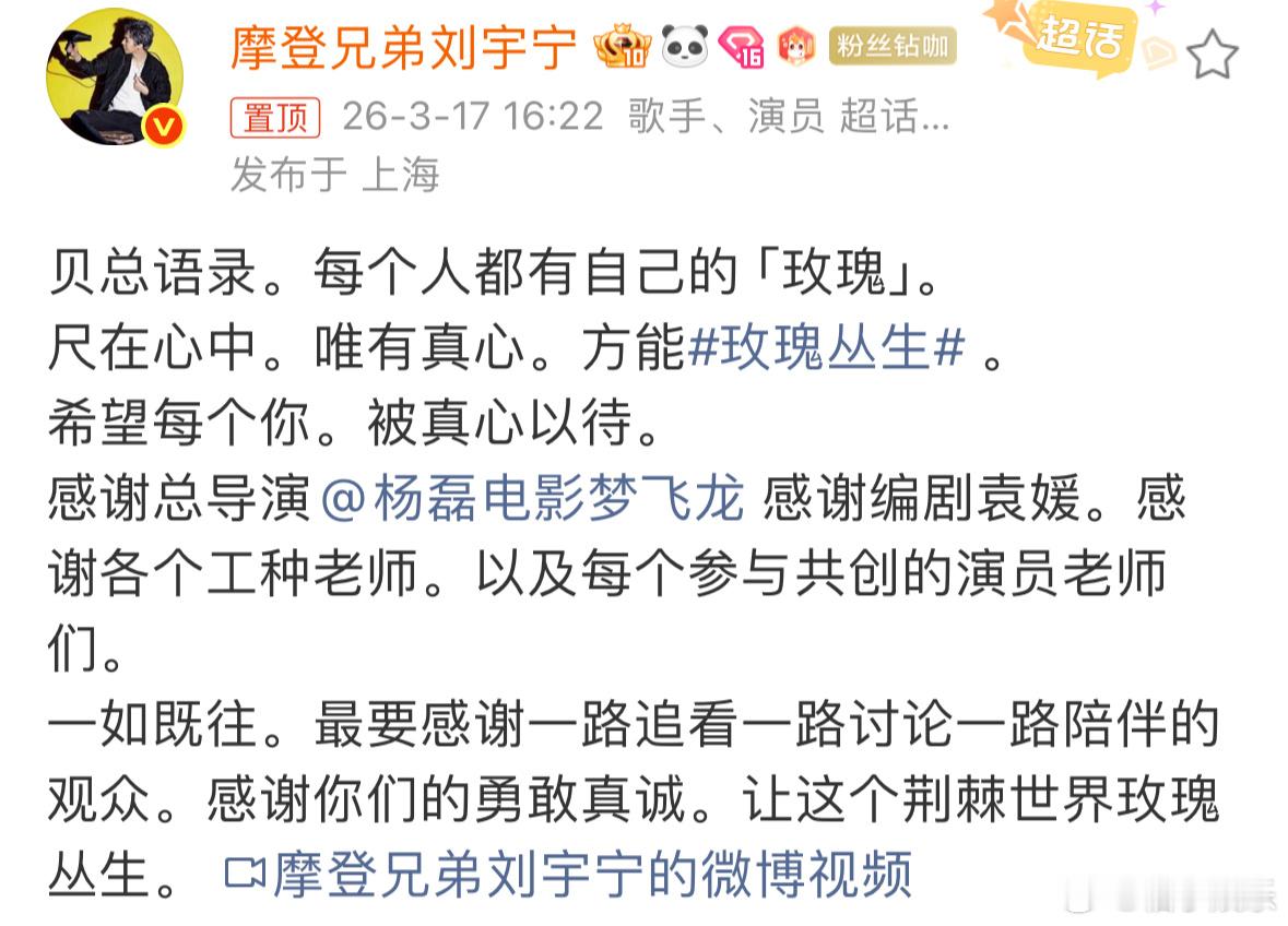 玫瑰丛生今日收官,刘宇宁发文告别小贝,收官快乐,谢谢刘宇宁带来最好的小贝,期待下个角色见!