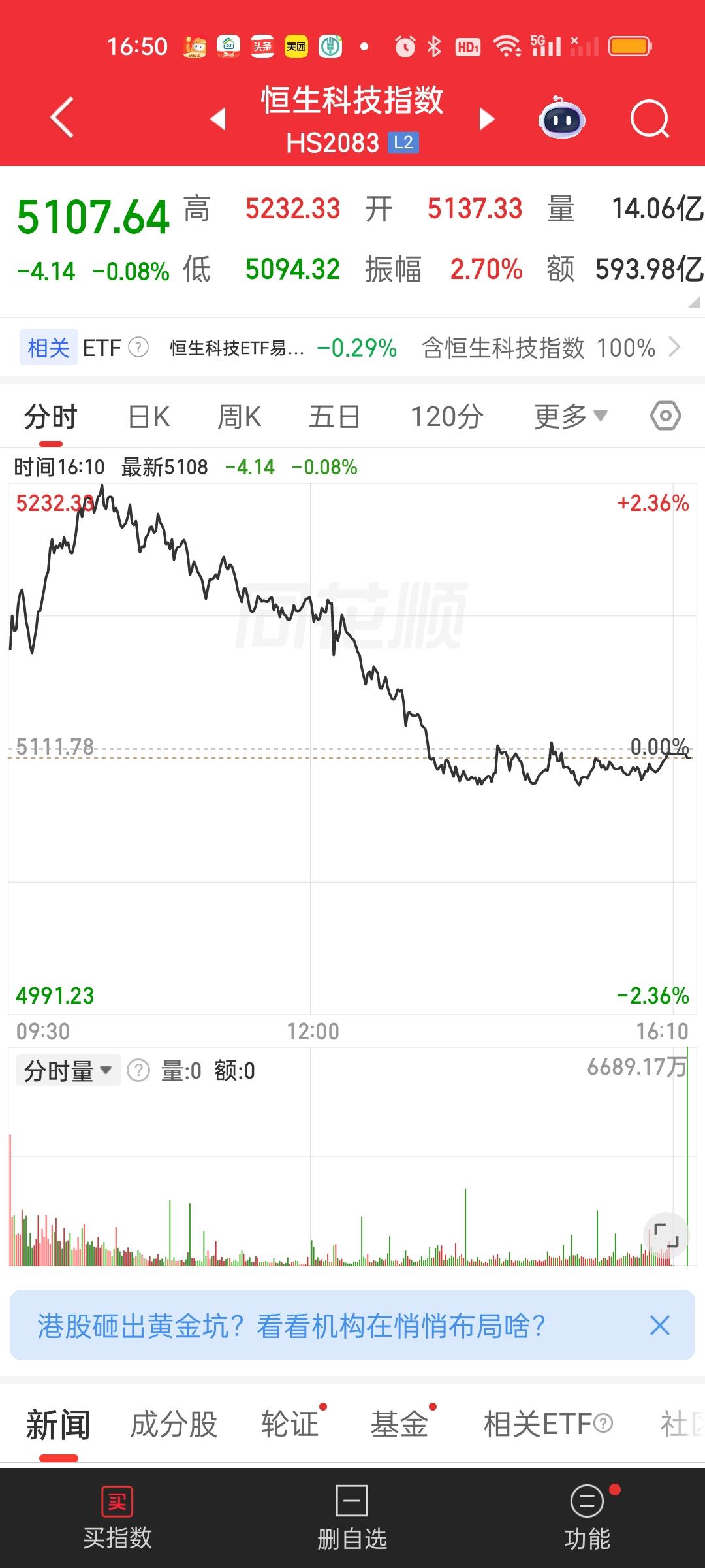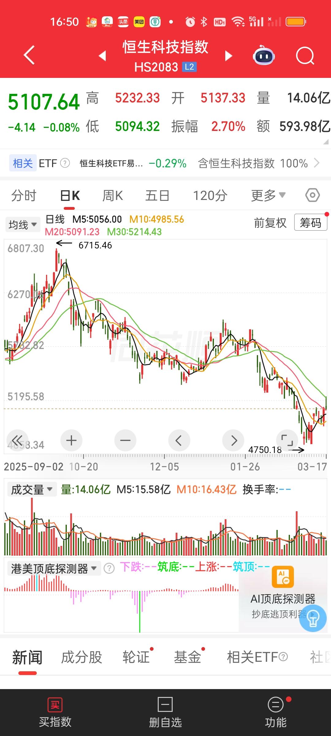 港股今天是冲高回落的走势,但不能认为它们要走下行趋势了。恒指今天20日线得而复失,恒科昨天站稳了20日线,今天曾经站上过30日线,但尾盘也是得而复失。现在的情况是恒指依旧在5日10日线上方,恒科依旧在5日10日20日线上方,所以不能认为这里要走下行趋势。从这个角度讲,依旧可以继续观望,不用太快做决定。