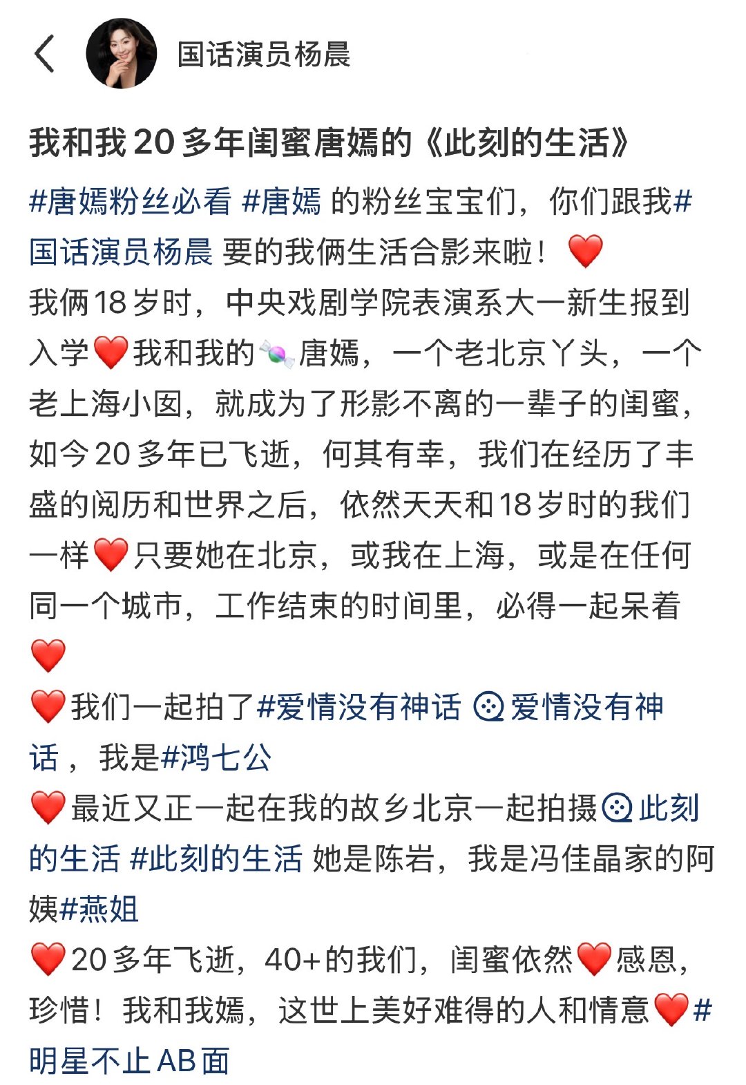 唐嫣杨晨 真闺蜜n搭唐嫣杨晨20多年闺蜜情 杨晨晒出与唐嫣的合照,解锁两人二十多年神仙友谊!从校园室友到荧幕搭档,一路陪伴彼此成长,岁月不改真心,双向奔赴的闺蜜情太让人羡慕了