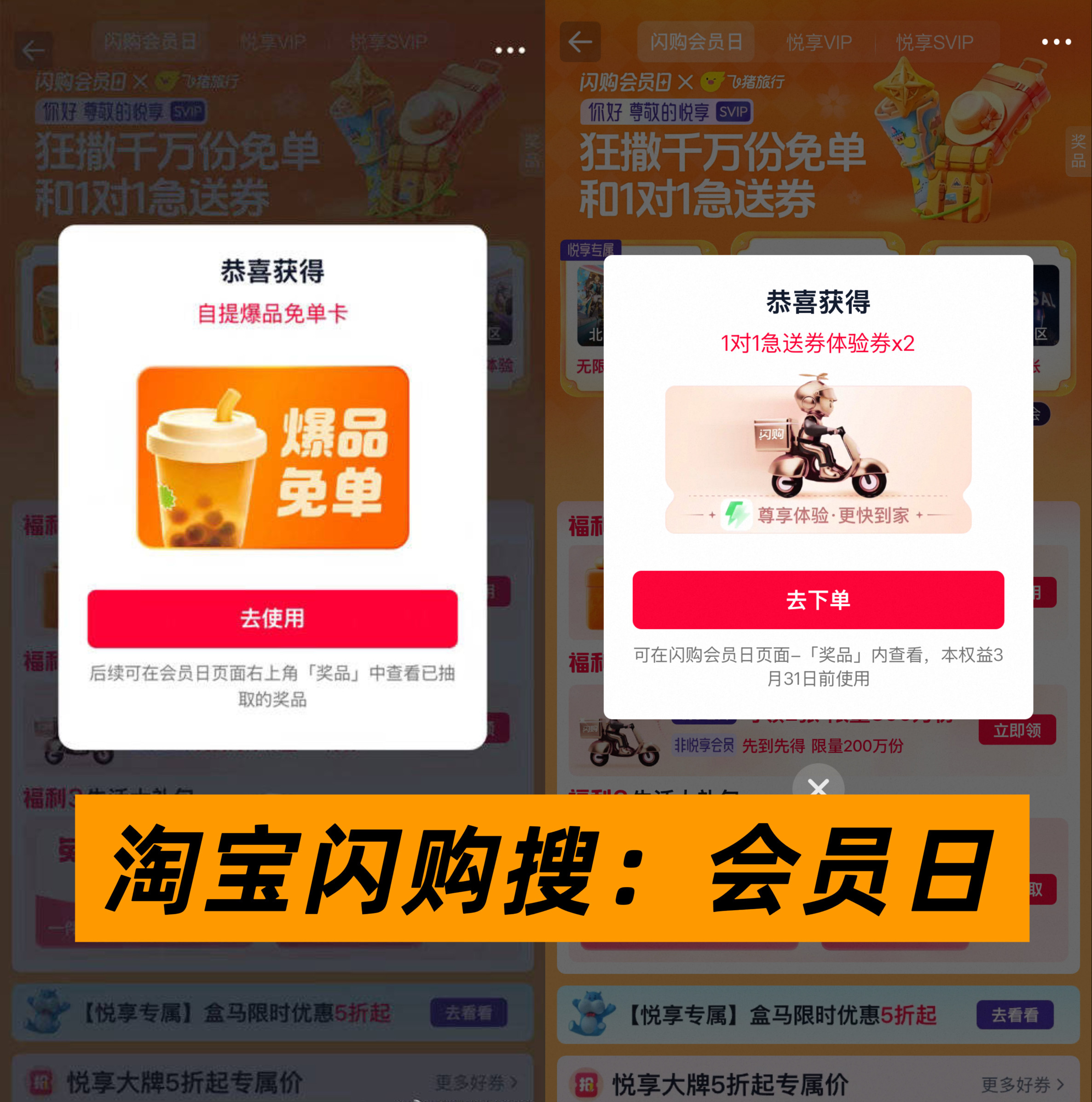 淘宝闪购会员日给到一个夯 作为资深悦享会员,这次真的被狠狠宠到。平时加班忘买刚需、临时缺东西,全靠1v1 急送救场!每个月还有专属免单卡,奶茶、零食、日用品都能用,白嫖的快乐谁懂啊!商超一件起送,再也不用凑单,还有最高888元生活礼包和专属大牌 5 折起,日常开销省超多。3 月17-18日更能抽北京环球影城门票、无限春日主题活动入场资格,悦享会员抽奖次数更多,中奖概率直接翻倍。快去淘宝闪购 - 我的 - 悦享会员,看看你的账号身份!也可以搜【会员日】直接参与会员日活动,抢千万份免单、1V1急送券!