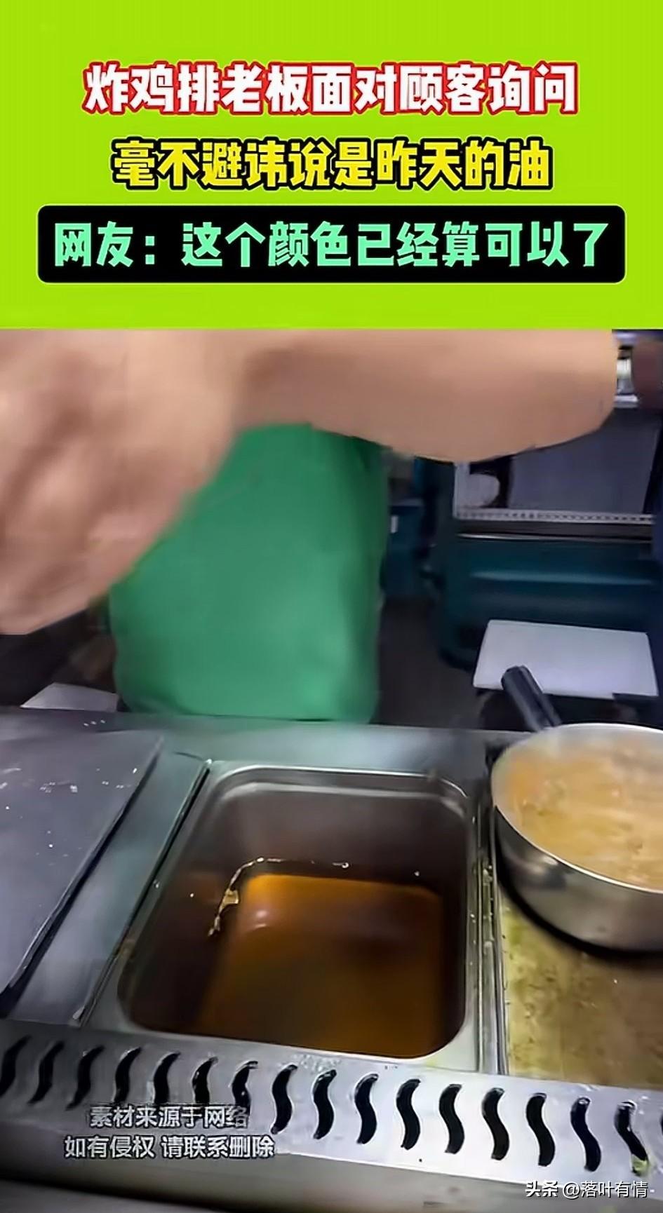 男子在摊位上买了一块炸鸡排, 老板是个戴眼镜的小伙子, 给他炸好之后递给了他, 当时冒昧的问了老板, 你的油是不是该换了? 戴眼镜的小伙子表示, 嗯,这油是用了三天了, 今天用完就换了, 男子笑了笑说,你太诚实了, 小伙子表示这有啥? 两个人都非常的坦荡, 男子问老板的目的, 就是讽刺他的油有点儿黑了, 结果没想到网友都说, 这油才用了三天, 挺好的,根本没有啥事儿, 又不是地沟油, 比有些老板的有好多了, 敢于当面告诉顾客的老板, 那都是对自己的产品有信心, 大家觉得对吗? 摆摊鸡排哥 油煎炸鸡排 鸡鸡排 鸡排炸制技巧