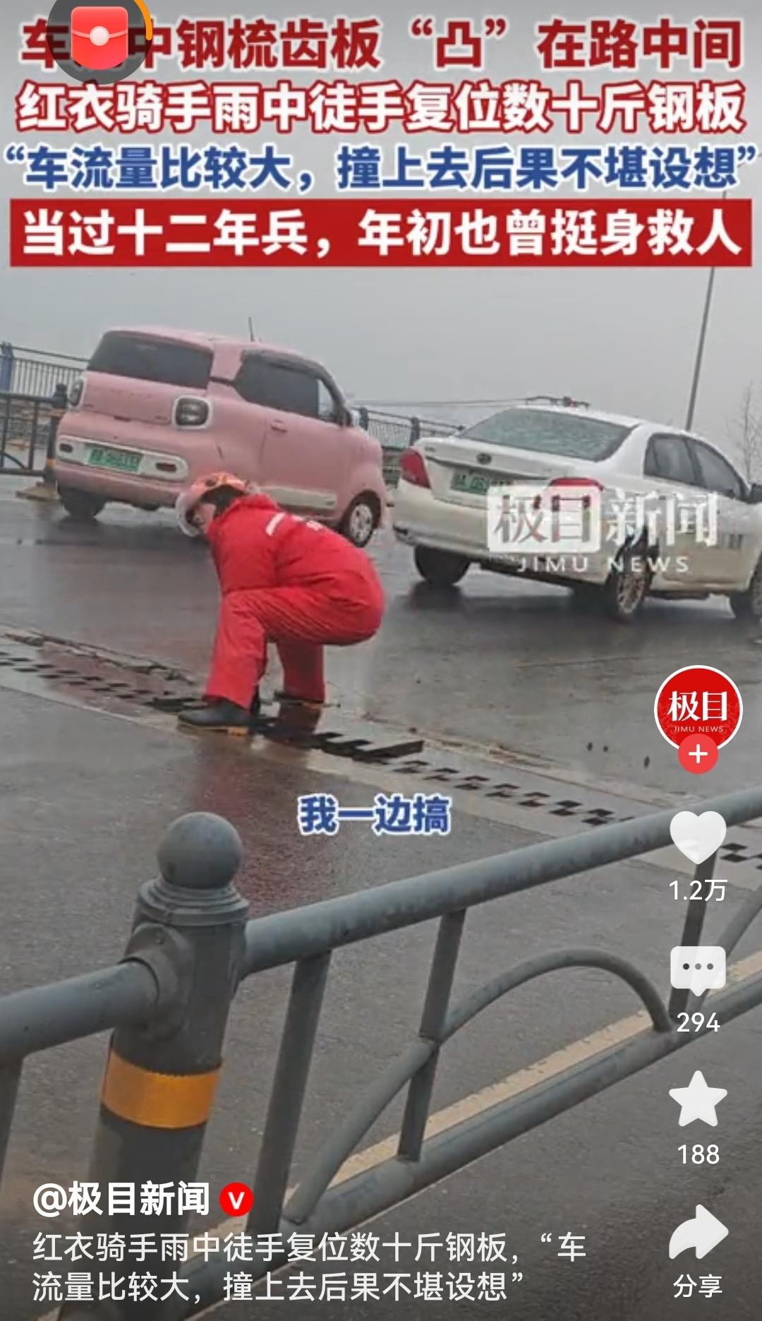 骑手雨中徒手复位数十斤钢板雨中的红衣身影格外动人,京东骑手焦浩冒雨徒手复位数十斤钢板,用行动守护了过往车辆的安全。当过兵的他始终保持着军人的担当,这份挺身而出的勇气与责任感,值得我们每一个人点赞与致敬![赞][赞][赞] 机械钢板 评论打卡任务