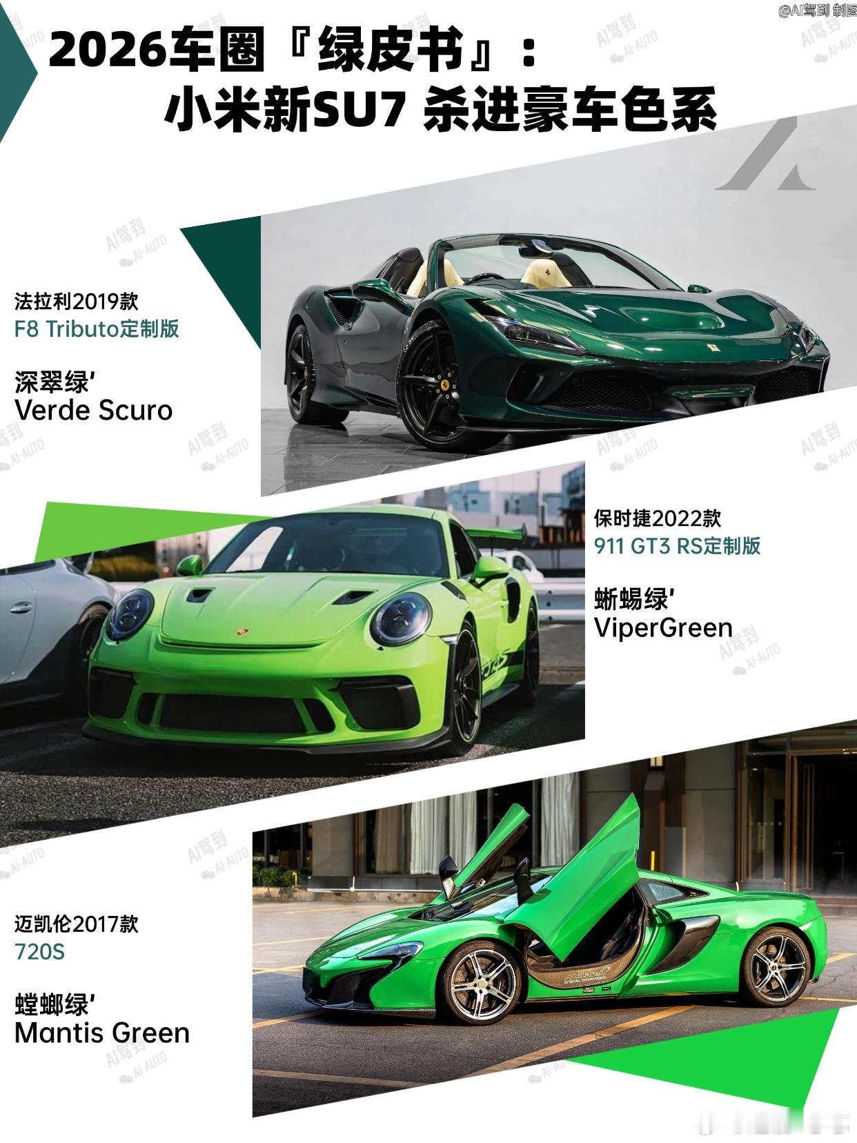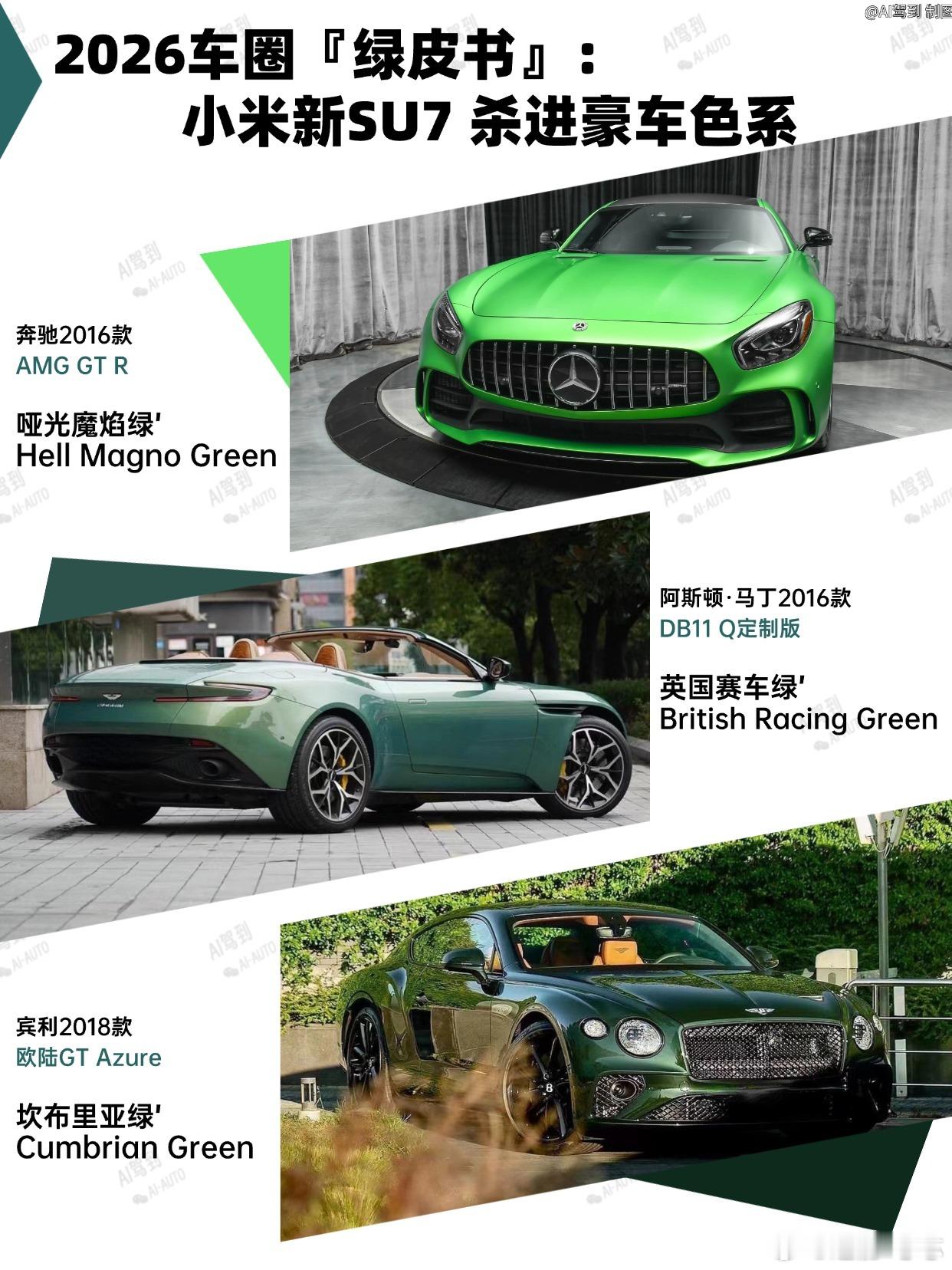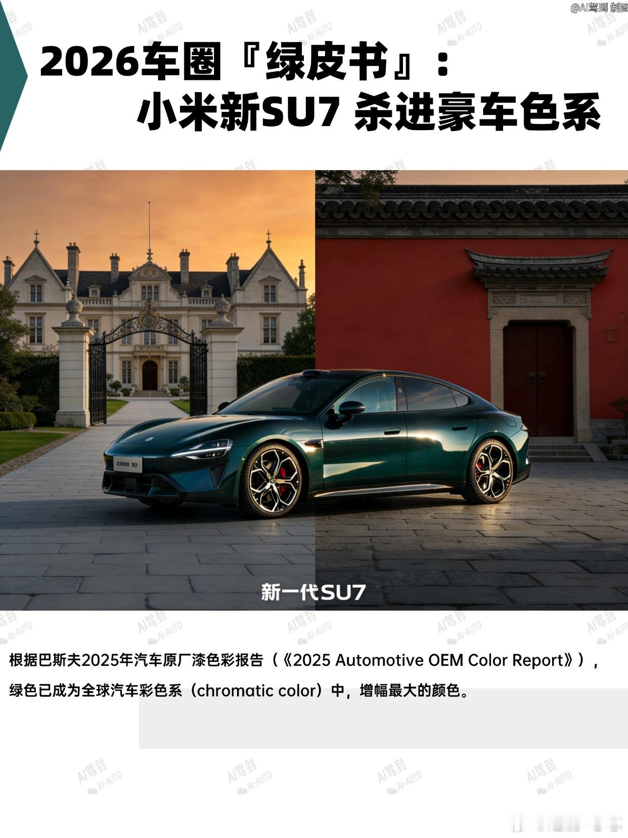 小米新SU7 靛石绿杀进豪车色系!最近被小米新SU7疯狂刷屏最后发布的「靛石绿」尤其让我有点心动!在车圈,绿色其实不好做,一不小心就土、就闷但如果做对了,会很有层次感——极显高级气质小米对车色一直很讲究的这次这抹「靛石绿」明显不是随便调个颜色这么简单而是要把自己换进“绿色豪车俱乐部”节奏!据官方说,灵感来自天然矿石色泽整体基调是深绿,再叠一层蓝绿珠光光线扫过车身,会透出一点蓝调光泽看上去低调但又很有高级感,完全不输豪车绿盘点下汽车史封神的绿色豪车,都是颜值与格调并存而且从趋势上看,这也不是偶然根据《2025 Automotive OEM Color Report》绿色已经是全球彩色系里增长最快的颜色之一某种程度上来说,大家开始厌倦黑白灰了更有表达欲的颜色正在回来。这次新一代SU7的「靛石绿」踩得挺准:不是为了“特别”而是刚好顺着这波“个性色彩回归”的趋势,往前走了一步。光看图看就觉得很有质感,现在九种颜色都已经陆续到店了心动的赶紧去线下店看看新一代su7