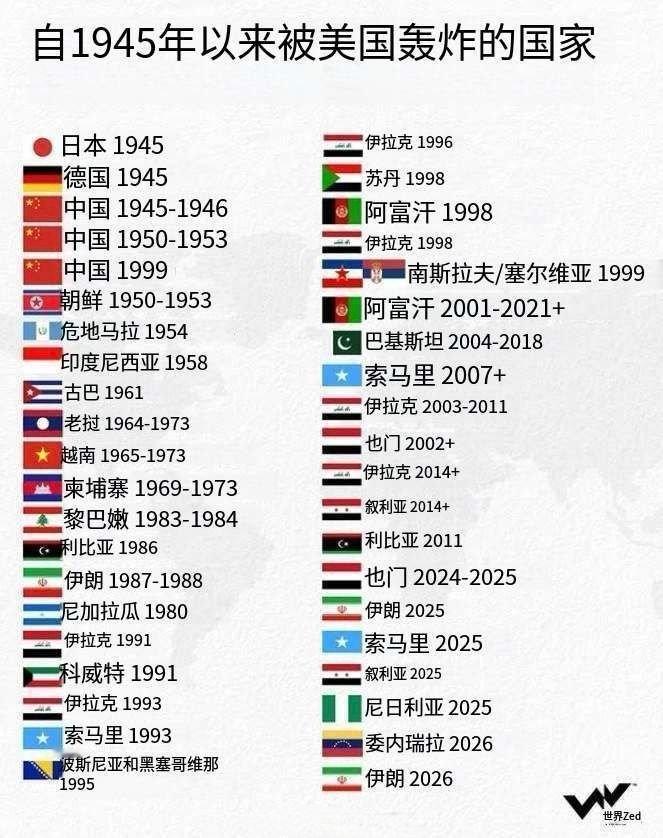 外媒列出了自1945年以来遭受美国打击的国家名单。