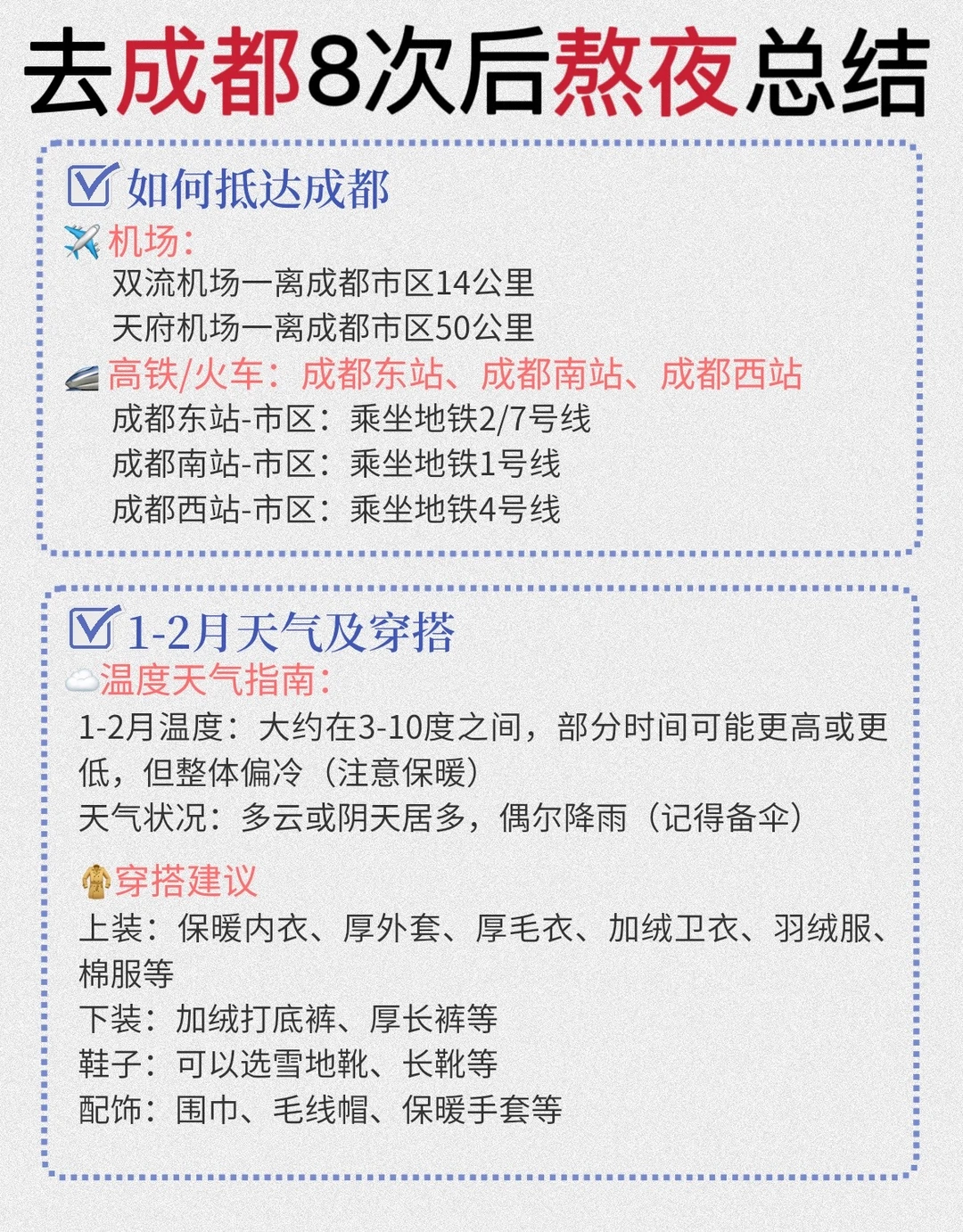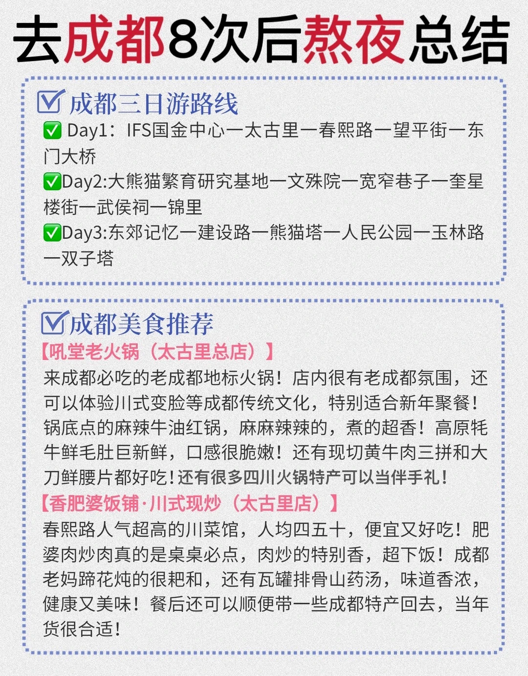 去了8次的✨成都旅游攻略,直接抄作业‼️ 寒假计划去成都的姐妹们,真的太适合这篇啦✔️从天气穿搭☁️到吃喝玩乐🍗、住宿交通🚴,一篇包全!无废话纯干货攻略分享!!! 💗【成都三日游路线】 Day1:IFS国金中心一太古里一春熙路一望平街一东门大桥 Day2:大熊猫繁育研究基地一文殊院一宽窄巷子一奎星楼街一武侯祠一锦里 Day3:东郊记忆一建设路一熊猫塔一人民公园一玉林路—双子塔 💗【成都美食推荐】 吼堂老火锅(太古里总店) 香肥婆饭铺•川式现炒(太古里店) 🎁成都伴手礼推荐: