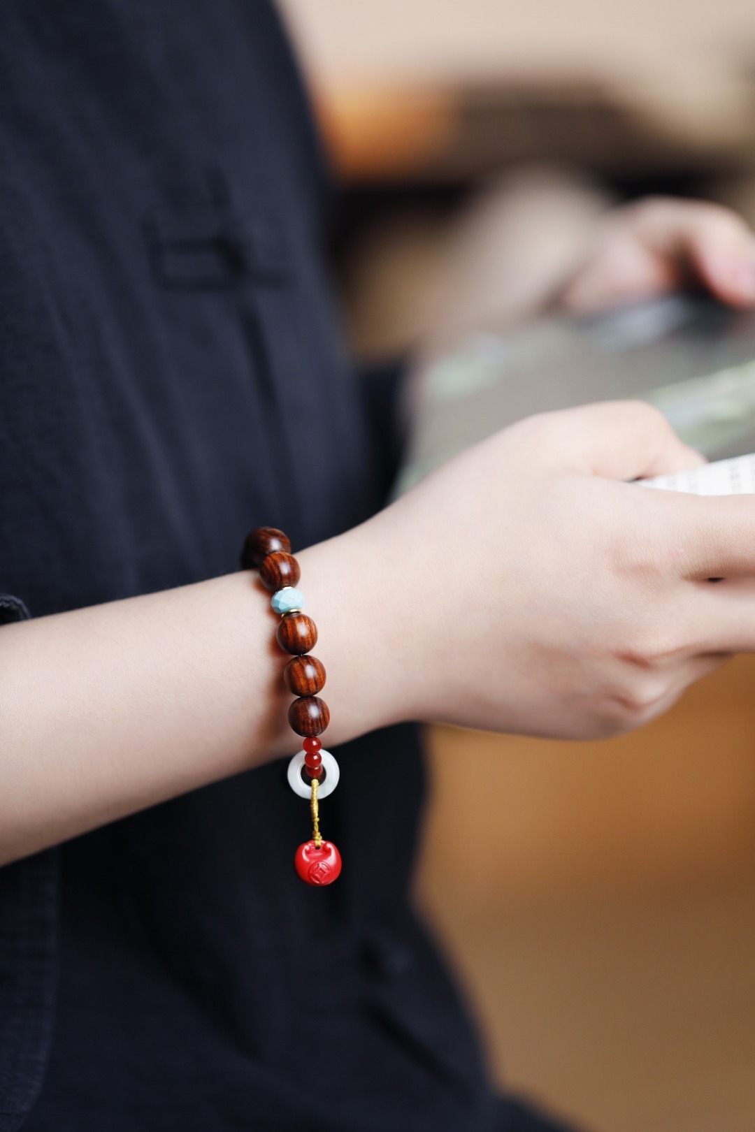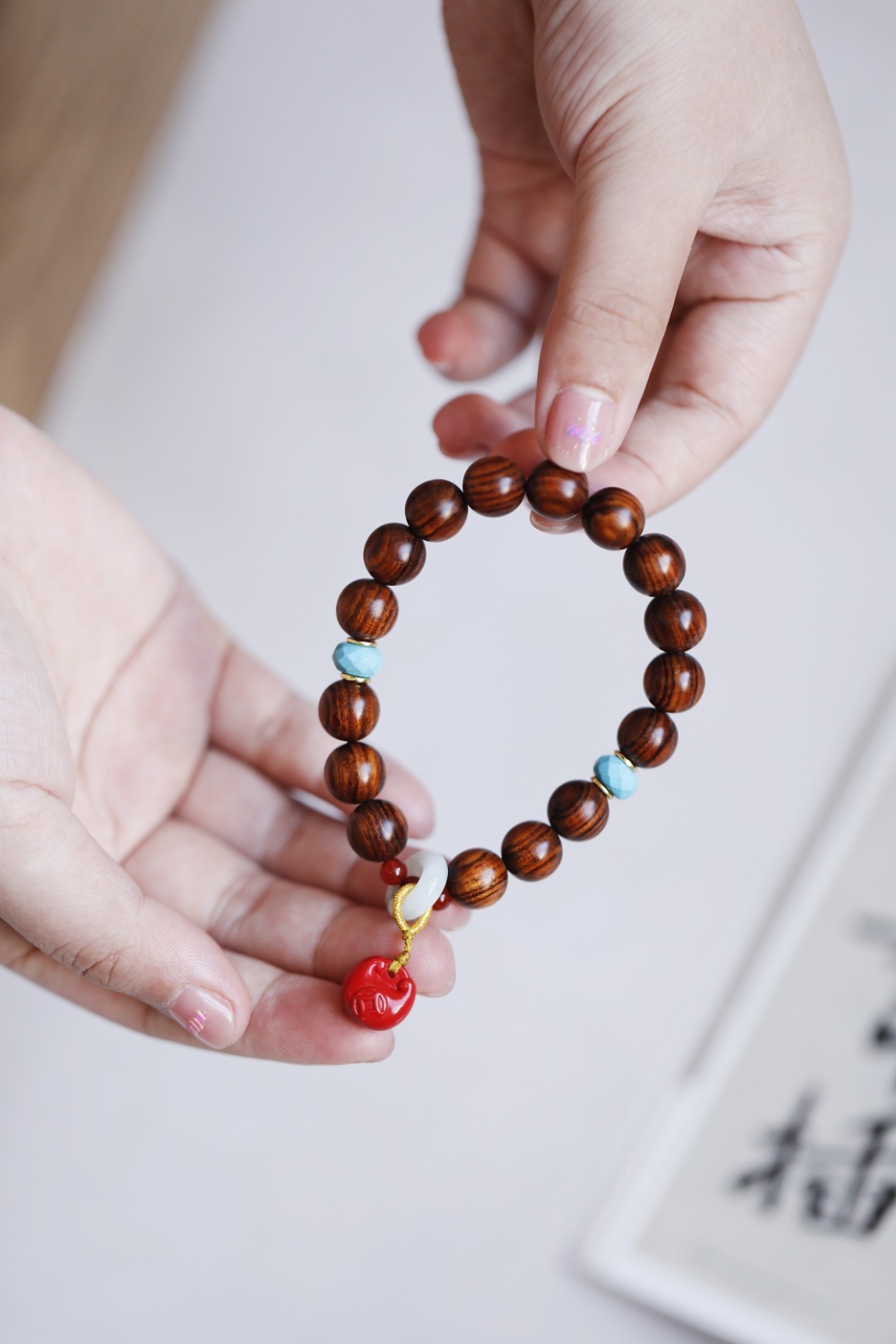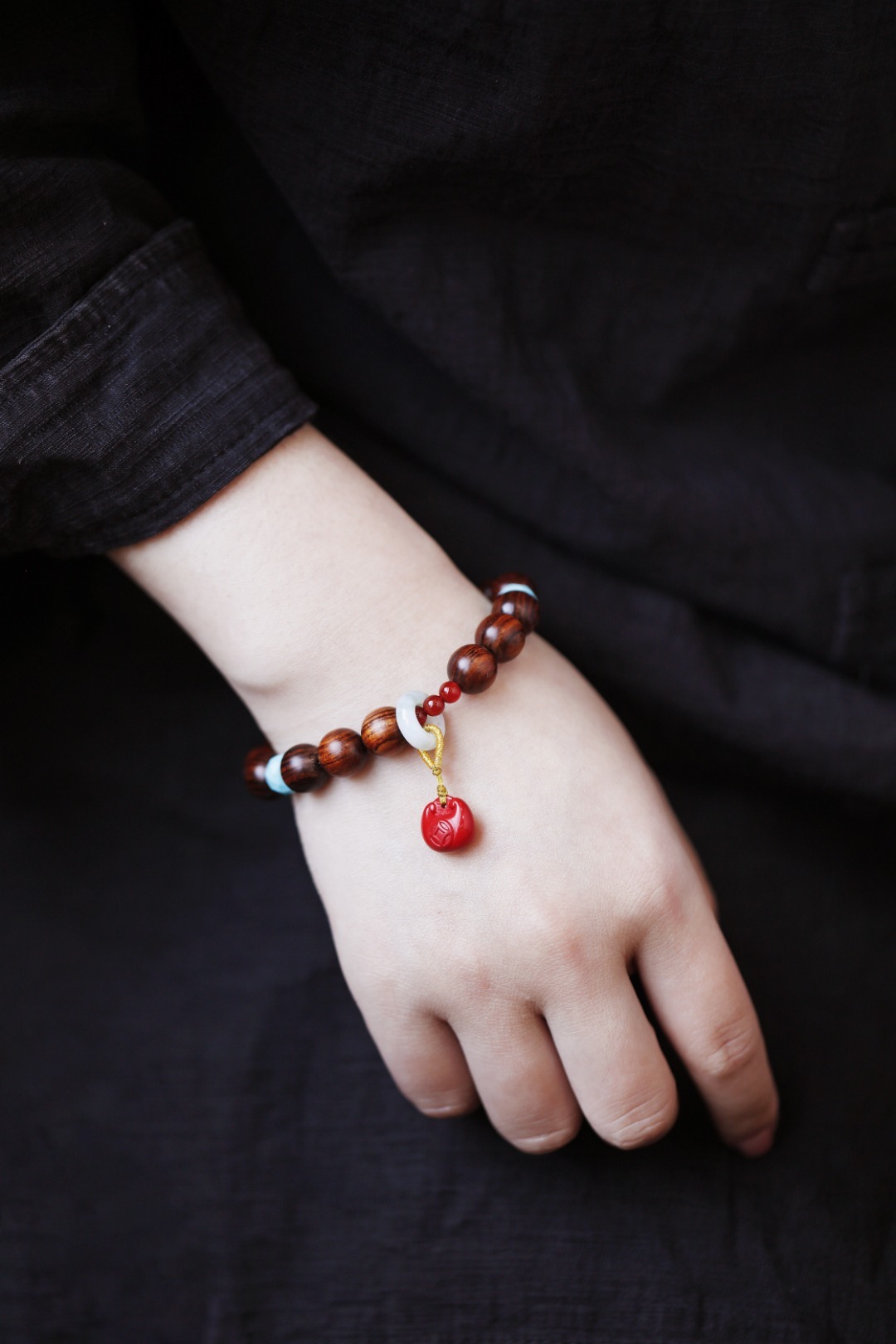 墨线清晰,其降香浓郁,珍宝加以点缀,莹润十足;手持轻捻,端庄有福。