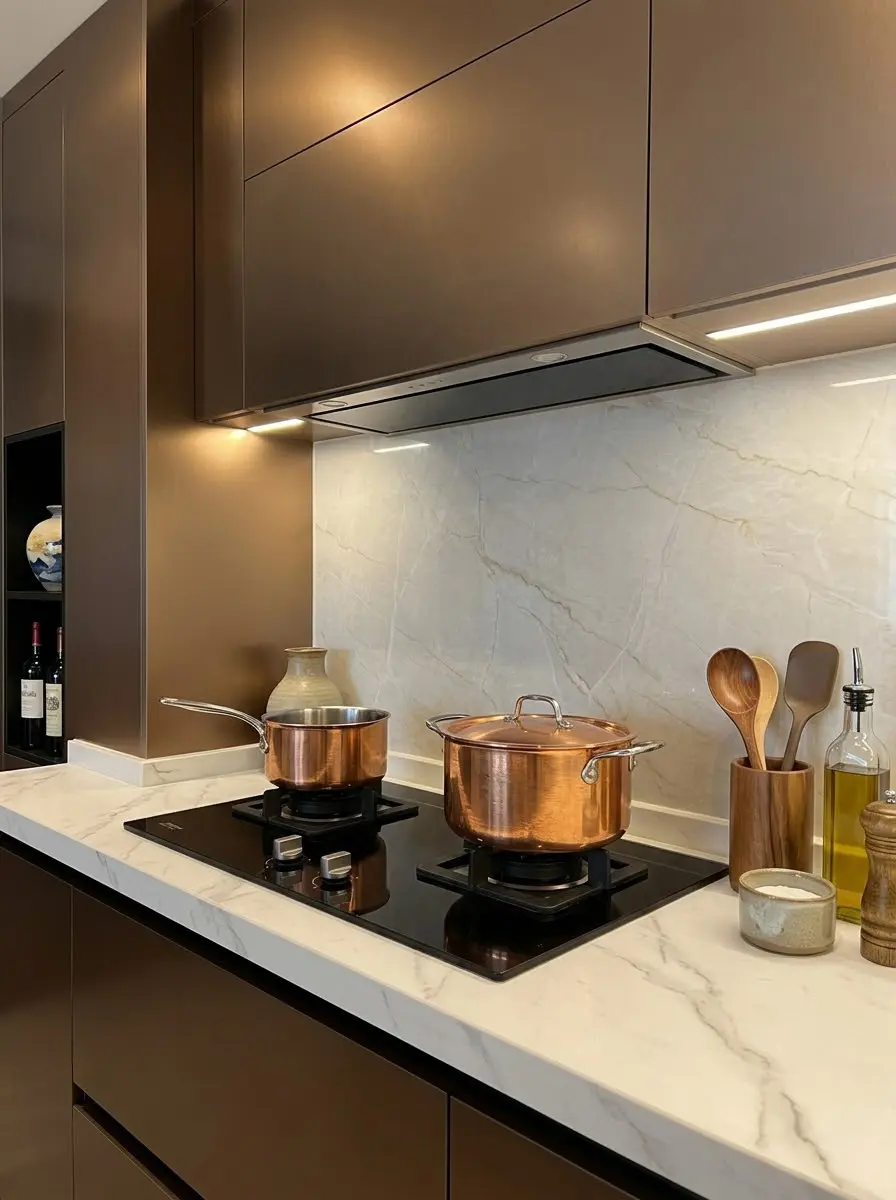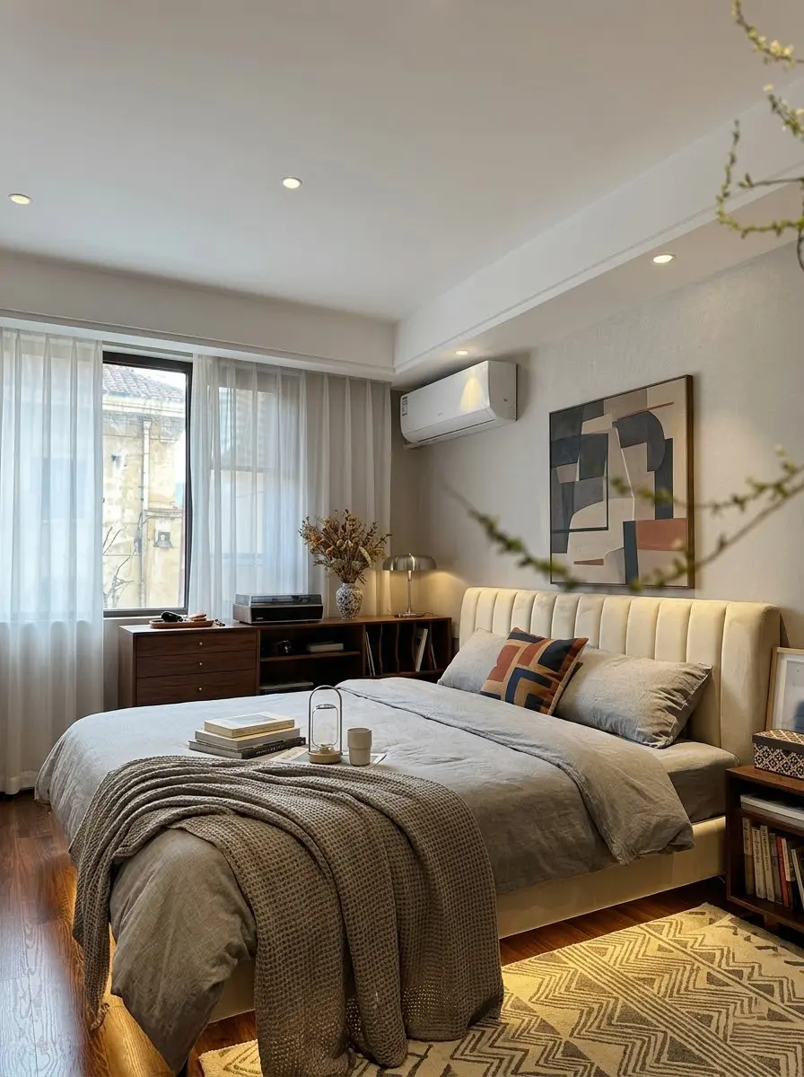 转入厨房,沉稳的哑光咖色定制橱柜不仅兼顾了强大的收纳功能,无把手设计更显立面整洁,与黄铜厨具碰撞出精致的奢华感✨。步入卧室,温馨的暖光结合质朴的棉麻床品与中古风木质边柜,用最纯粹的材质抚平一天的疲惫,营造出绝对静谧的安睡氛围🛌。