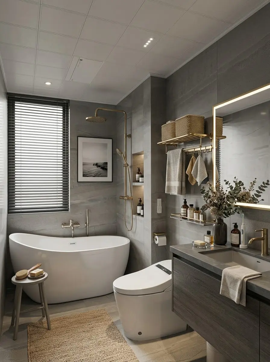 卫浴空间引入了高级的灰色石纹肌理,优雅的独立浴缸与拉丝黄铜花洒交相辉映,让每一次沐浴都成为一场私享SPA🛁。这套居所摒弃了繁杂的装饰,用干净的线条与极致的材质,完美诠释了“少即是多”的居住哲学🌿。