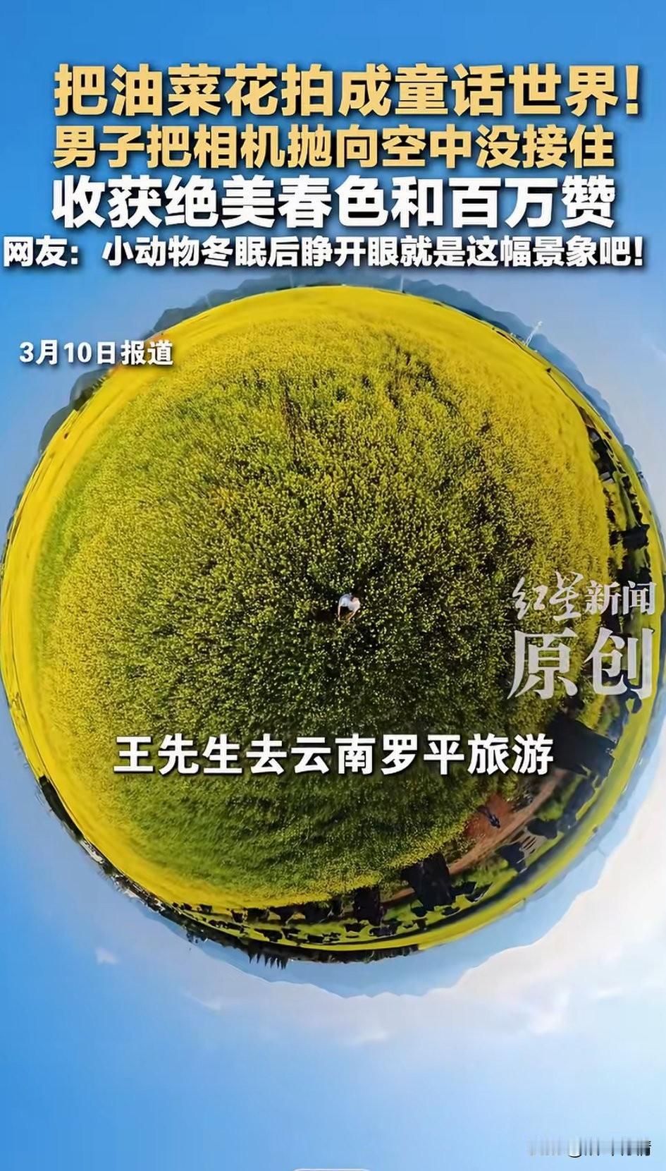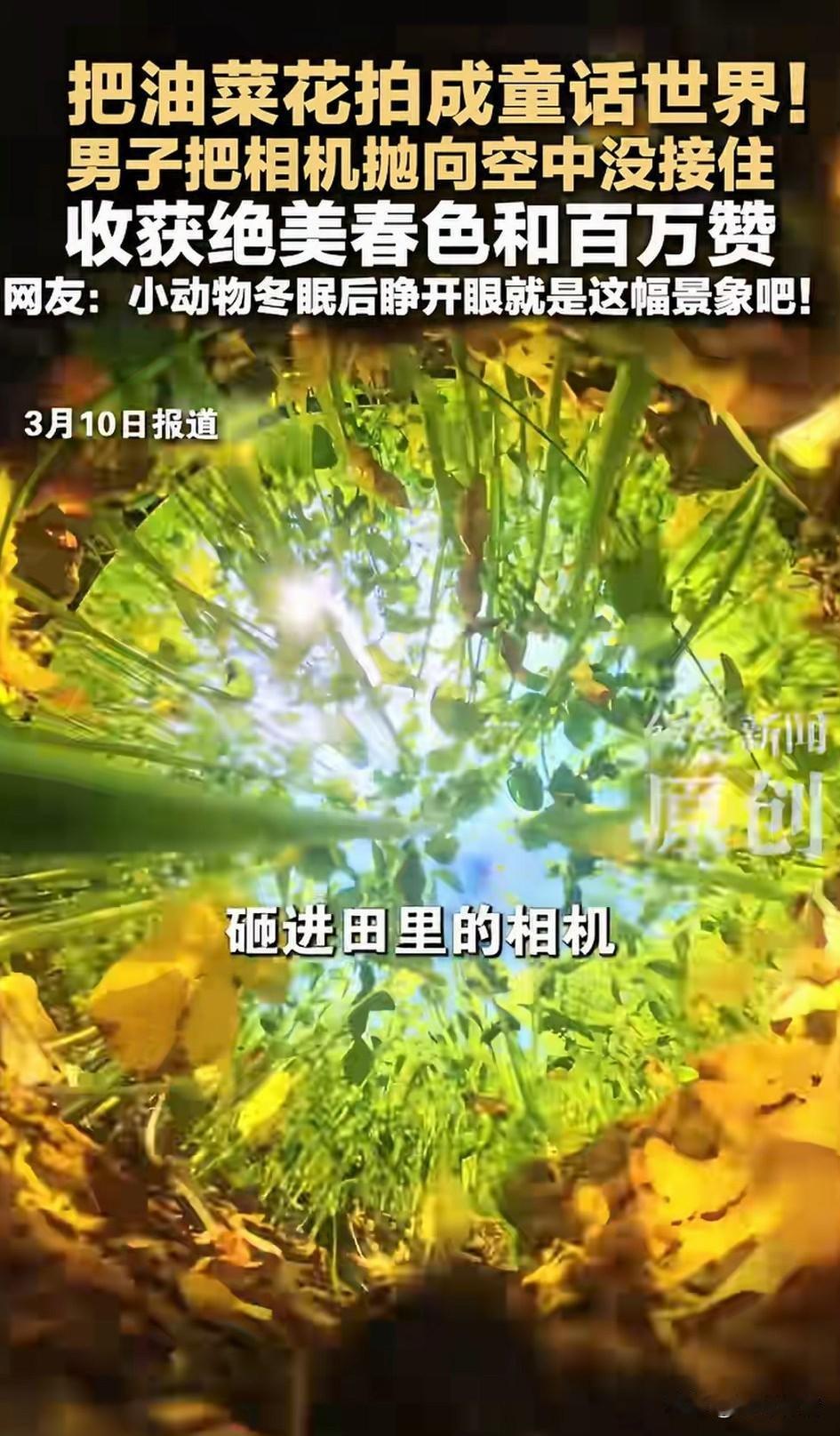男子在油菜花地拍摄, 突然产生了一个想法, 那就是把相机抛起来, 看看能拍到什么奇异的风景? 结果手没有接住, 相机直接掉在了油菜花地里, 不过正是因为这个失误, 让他拍到了绝美的风景, 他自己也没有想到, 自己这样拍出来的风景, 会获得百万网友的点赞, 可以说这个场景, 才是韭菜花最美的拍摄手法, 让人想起了一部电影, 亚瑟的迷你王国里面的场景, 很多网友表示, 这个角度是很多动物睁开眼睛时候看到的,确实非常的奇特! 一个失误造就了经典, 这就是拍摄的乐趣, 大家喜欢油菜这位博主拍的油菜花风景吗? 油菜花田野写真 麦田地油菜花 油菜花背影 油菜花花田写真