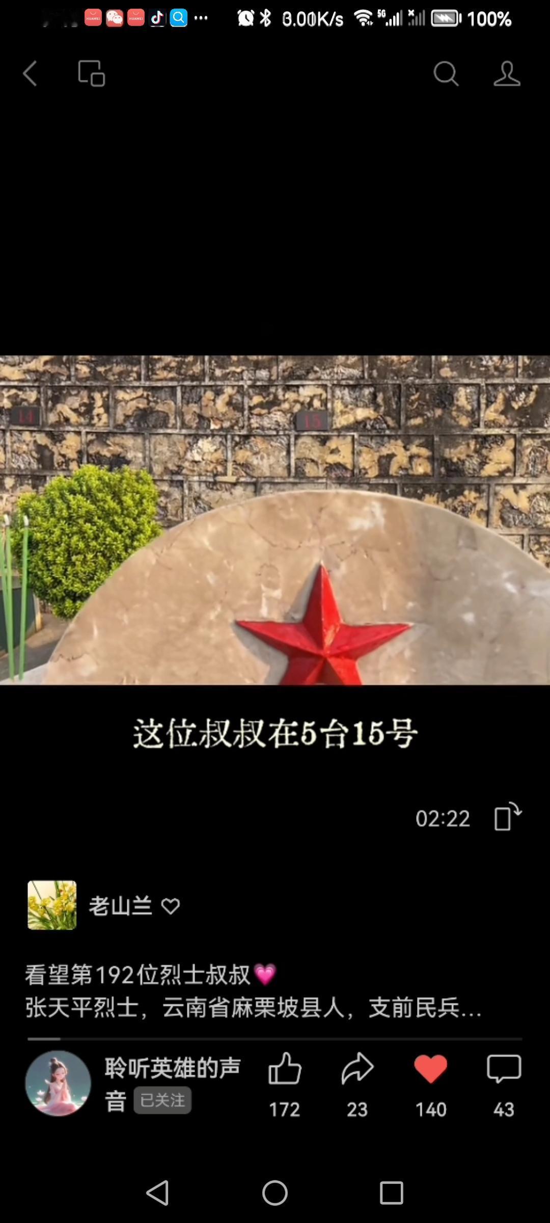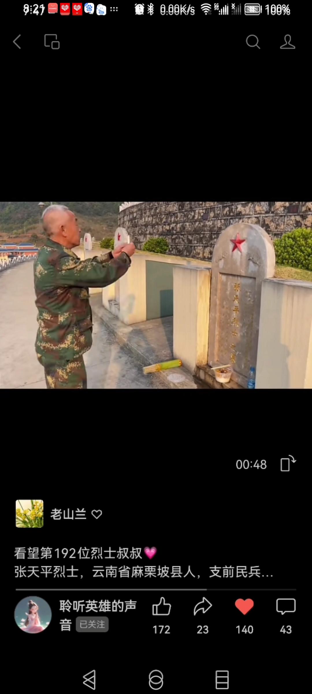 跟随“聆听英雄的声音”聆听英雄故事:第192位烈士💗 张天平烈士,云南省麻栗坡县人,支前民兵,1979年3月11日,在中越边境自卫还击作战中光荣牺牲,时年28岁。 今天是她与师傅朱效悯(老山之眸)一起带重返当年战场的参战老兵们,登上“八十年代上甘岭”等阵地返回后来到烈士陵园的。为她风雨无阻的坚守诺言点赞! 向她和她的师傅等老山爱心志愿者们致敬!