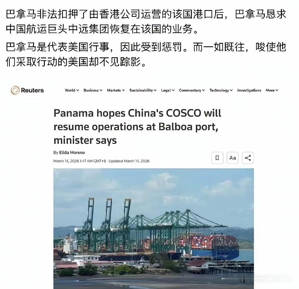 巴拿马政府肠子都悔青了! 你对我不仁,别怪我不义! 当我们开始严查巴拿马籍货轮的时候,巴拿马慌了, 当我们开始反制出手的时候,老美躲在了后面,巴拿马慌了。 一个小小的巴拿马就想着欺负我们东方大国,这可不是要付出代价的。 现在想回头让我们中国企业重新运营港口,晚了。