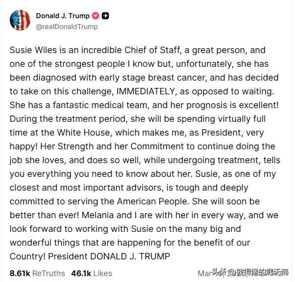 快讯:白宫大总管、MAGA梦之队的中流砥柱——苏西·威尔斯被川普气出了乳腺癌。[