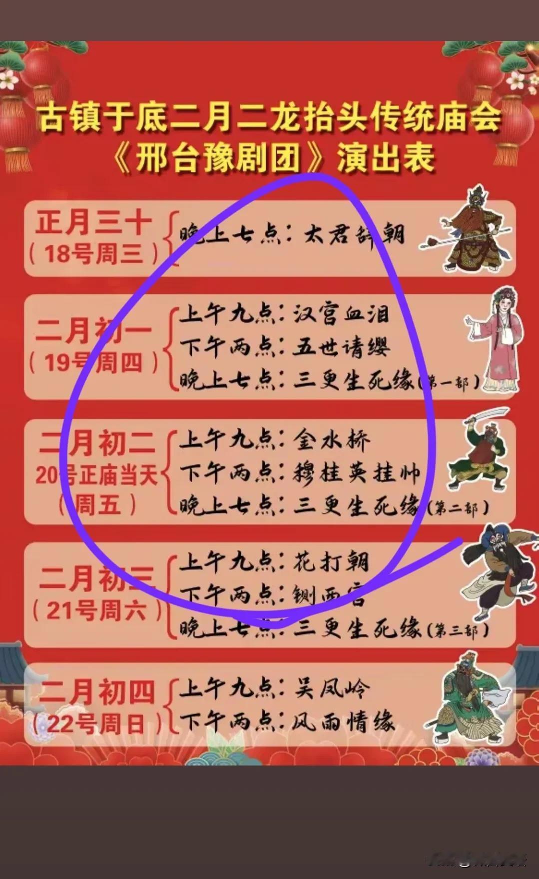 【超期待!石家庄新华区,于底庙会】 二月二龙抬头期间,石家庄的庙会热闹非凡!新华区于底社区在2026年3月18日 - 22日举办“古镇于底二月二龙抬头传统庙会”,地点就在古镇文化广场!这次特邀邢台市豫剧团助兴演出,足足有12场次精彩剧目,想想就超期待。 石家庄新华区于底古镇,阴历二月二龙抬头传统庙会欢迎大家。舞龙表演,一般都是在上午9点左右!二月二正庙会一定去,去年去的早了没看到耍龙! 《邢台豫剧团》演出表 1,正月三十,晚上七点:太君辞朝 2,二月初一上午九点:汉宫血泪 下午两点:五世请缨(19号周四) 晚上七点:三更生死缘(第一部) 3,二月初二,20号正庙当天 上午九点:金水桥 下午两点:穆桂英挂帅 晚上七点:三更生死缘(第二部) 4,二月初三,上午九点:花打朝 下午两点:铡西宫 晚上七点:三更生死缘(第三部) 5,二月初四,上午九点:吴凤岭 下午两点:风雨情缘 带定位晒今日生活 信息图片来源网络侵权联删