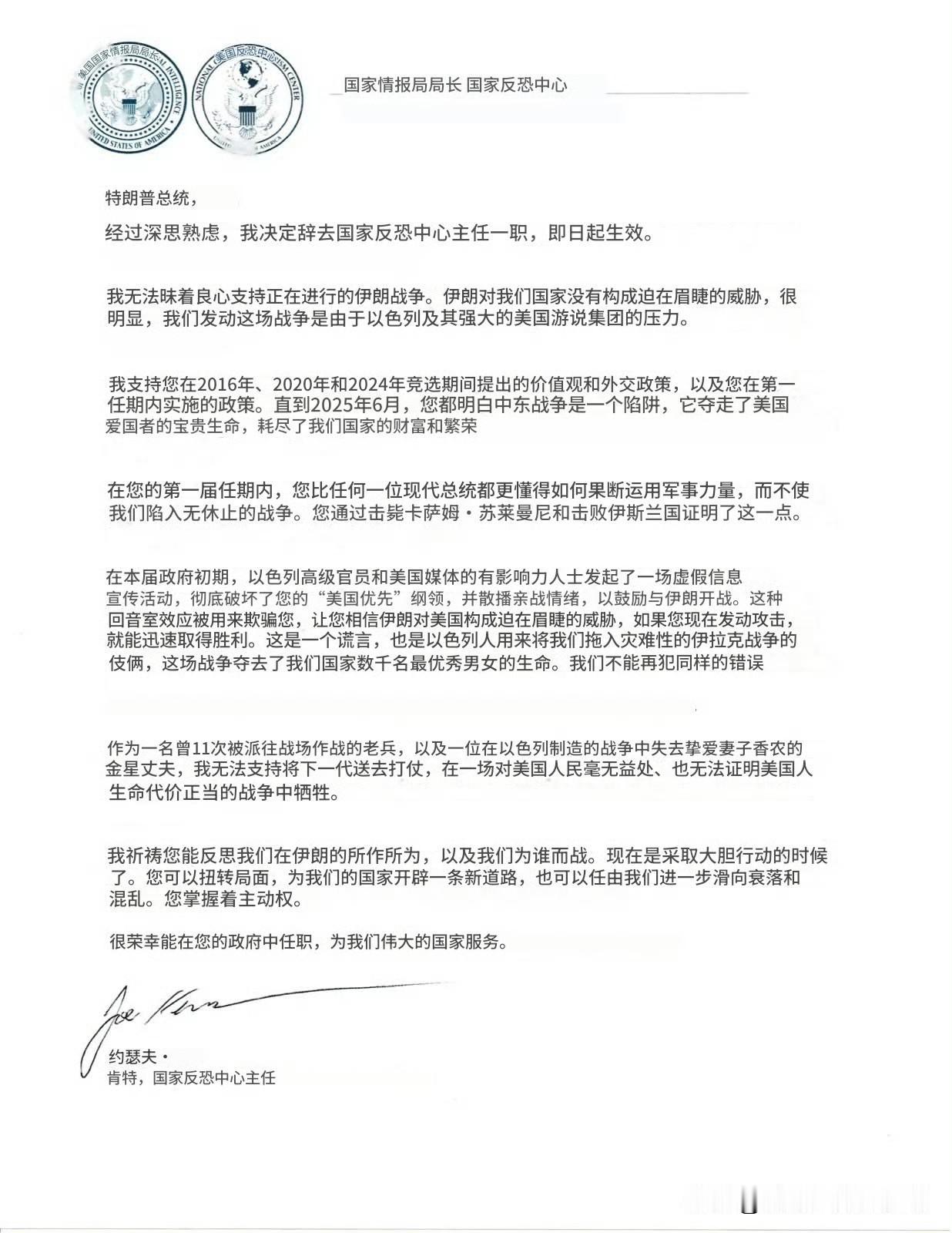 特朗普的国家反恐中心主任乔·肯特辞职,辞职信内容如下: 特朗普总统,经过深思熟虑,我决定辞去国家反恐中心主任一职,即日起生效。 我无法昧着良心支持正在进行的伊朗战争。伊朗对我们国家没有构成迫在眉睫的威胁,很明显我们发动这场战争是由于以色列及其强大的美国游说集团的压力。 我支持您在2016年,2020年和2024年竞选期间提出的价值观和外交政策,以及您在第一任期内实施的政策。直到2025年6月,您都明白中东战争是一个陷阱,它夺走了美国爱国者的宝贵生命,耗尽了我们国家的财富和繁荣。 在您的第一届任期内,您比任何一位现代总统都更懂得如何果断运用军事力量,而不使我们陷入无休止的战争。您通过击毙卡萨姆。苏菜曼尼和击败伊斯兰国证明了这一点。 在本届政府初期,以色列高级官员和美国媒体的有影响力人士发起了一场虚假信息宣传活动,彻底破坏了您的"美国优先"纲领,并散播亲战情绪,以鼓励与伊朗开战。这种回音室效应被用来欺骗您,让您相信伊朗对美国构成迫在眉睫的威胁,如果您现在发动攻击,就能迅速取得胜利。这是一个谎言,也是以色列人用来将我们拖入灾难性的伊拉克战争的伎俩,这场战争夺去了我们国家数千名最优秀男女的生命。我们不能再犯同样的错误 作为一名曾11次被派往战场作战的老兵,以及在以色列制造的战争中失去挚爱妻子香农的金星丈夫,我无法支持将下一代送去打仗,在一场对美国人民毫无益处,也无法证明美国人生命代价正当的战争中牺牲。 我祈祷您能反思我们在伊朗的所作所为,以及我们为谁而战。现在是采取大胆行动的时候了。您可以扭转局面,为我们的国家开辟一条新道路,也可以任由我们进一步滑向衰落和混乱。您掌握着主动权。 很荣幸能在您的政府中任职,为我们伟大的国家服务。 约瑟夫·肯特,国家反恐中心主任 来源:/CIG/Telegram|Counter Intelligence Global #哈梅内伊遇害##以色列宣布袭击伊朗##伊朗这次不想忍了#