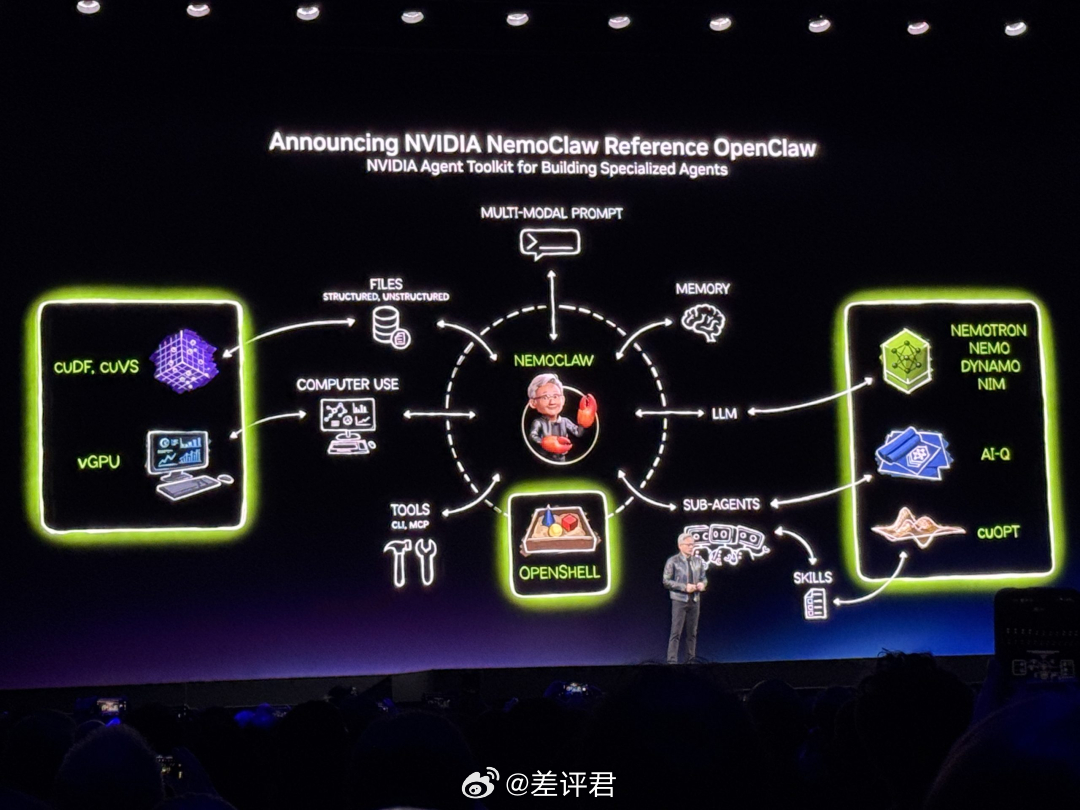 除了硬件,老黄也在搞龙虾。不过是更高规格的企业级代理平台,叫“NemoClaw”。 它被称作是Linux一样的“新操作系统”,内置安全层,支持自主进化和全天候运行,并用NVIDIA Agent Toolkit加固了安全性。