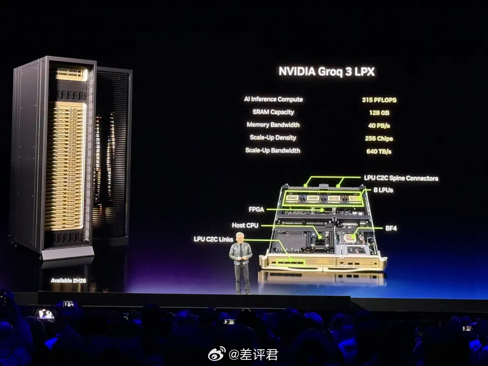 这次老黄也没藏着,直接宣布已经把LPU集成到了Vera Rubin平台,推出了NVIDIA Groq 3 LPX作为推理加速器。内存带宽足足 40 PB/s,是这次Rubin GPU机柜的25倍,推理速度直接起飞。