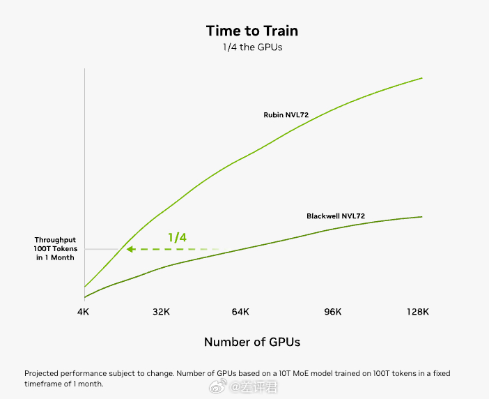 好了就介绍了2分钟游戏,后面全是AI。先是Vera Rubin新平台,作为继Blackwell后的新一代架构,这是未来几年英伟达AI算力的核心王牌。在主力Vera Rubin NVL72机柜中,单机架能塞进72颗Rubin GPU + 36颗Vera CPU,训练MoE模型只需上一代Blackwell的1/4 GPU算力,效率飞升,而且已经量产,预计是下半年出货。