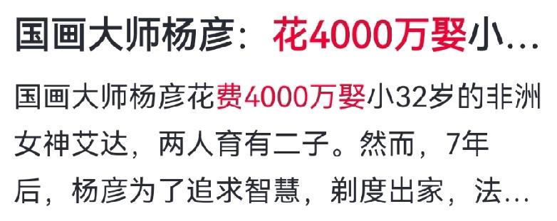 53岁画家花4000万娶非洲新娘,7年后抛妻弃子出家?真相震撼全网 他是画坛泰斗,一幅画拍出6600万天价,师从李可染、黄胄,名利双收。 为一句少年承诺,他走遍非洲50国,只为寻一尊木雕少女的模样。 2011年,53岁的他偶遇24岁大学生爱达,两人长相竟如复刻。 他花4000万办世纪婚礼,包机接非洲亲友,千桌宴席轰动京城。 婚后7年,爱达学中文、习国画,作品登国博,两子绕膝,家庭圆满。 可2018年,60岁的他突然宣布出家!留万贯家财与妻儿,遁入终南山。 他说:“世俗让我迷失,我要找回画画的本心。” 前半生红尘纵情,后半生青灯古佛。 有人说他疯了,有人赞他通透。 这世间真有人,敢把人生过成两种极致! 对此,你有何认知度? 奇人异事 传奇人生 画坛泰斗