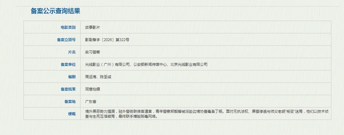 周运海、陈至诚编剧电影《实习警察》,备案单位:光线影业(广州)有限公司、公安部新闻传媒中心、北京光线影业有限公司。梗概:境外黑恶势力猖獗,驻外警务联络官遇害,青年警察郑毅等被派赴边境协查毒枭丁杨。面对无执法权、黑警渗透与师父老胡"叛变"迷局,他们以技术侦查与生死互信破局,最终联手摧毁贩毒网络