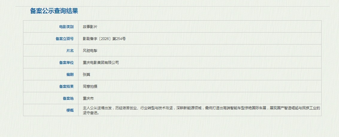 张冀(《中国合伙人》《亲爱的》)编剧电影《风驰电掣》,梗概:主人公从逆境出发,历经艰苦创业、行业转型与技术攻坚,深耕新能源领域,最终打造出高端智能车型惊艳国际车展、展现国产智造崛起与民族工业的坚守奋进。