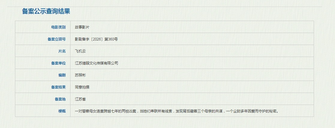 苏照彬(《镖人:风起大漠》《双瞳》)编剧电影《飞机云》立项,梗概:一对警察母女追查跨越七年的两桩凶案,当她们串联所有线索,发现背后藏着三个母亲的共谋,一个尘封多年因爱而守护的秘密。