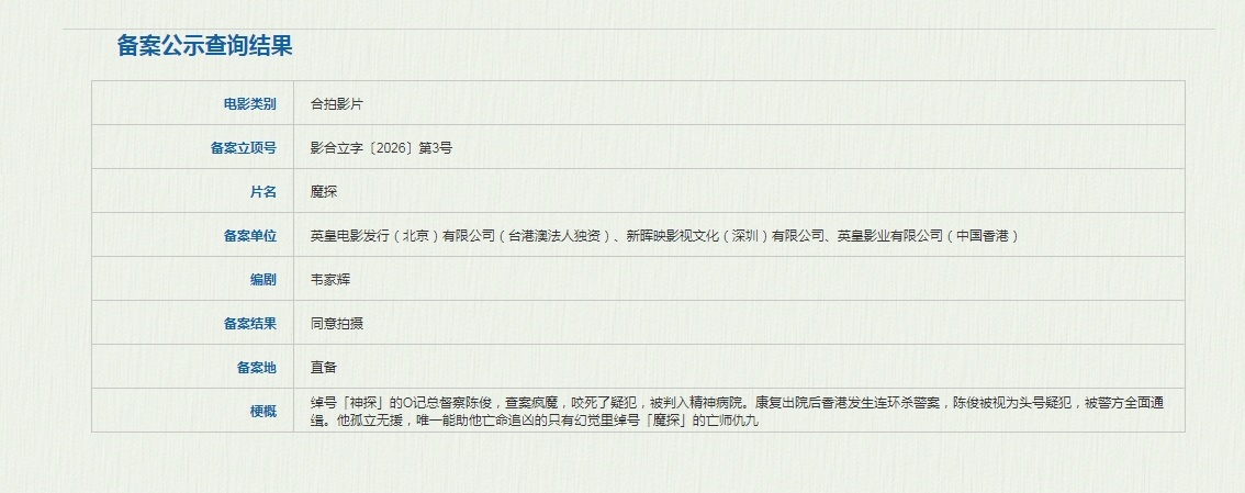 韦家辉(《神探》《神探大战》)编剧电影《魔探》,梗概:绰号「神探」的O记总督察陈俊,查案疯魔,咬死了疑犯,被判入精神病院。康复出院后香港发生连环杀警案,陈俊被视为头号疑犯,被警方全面通缉。他孤立无援,唯一能助他亡命追凶的只有幻觉里绰号「魔探」的亡师仇九。