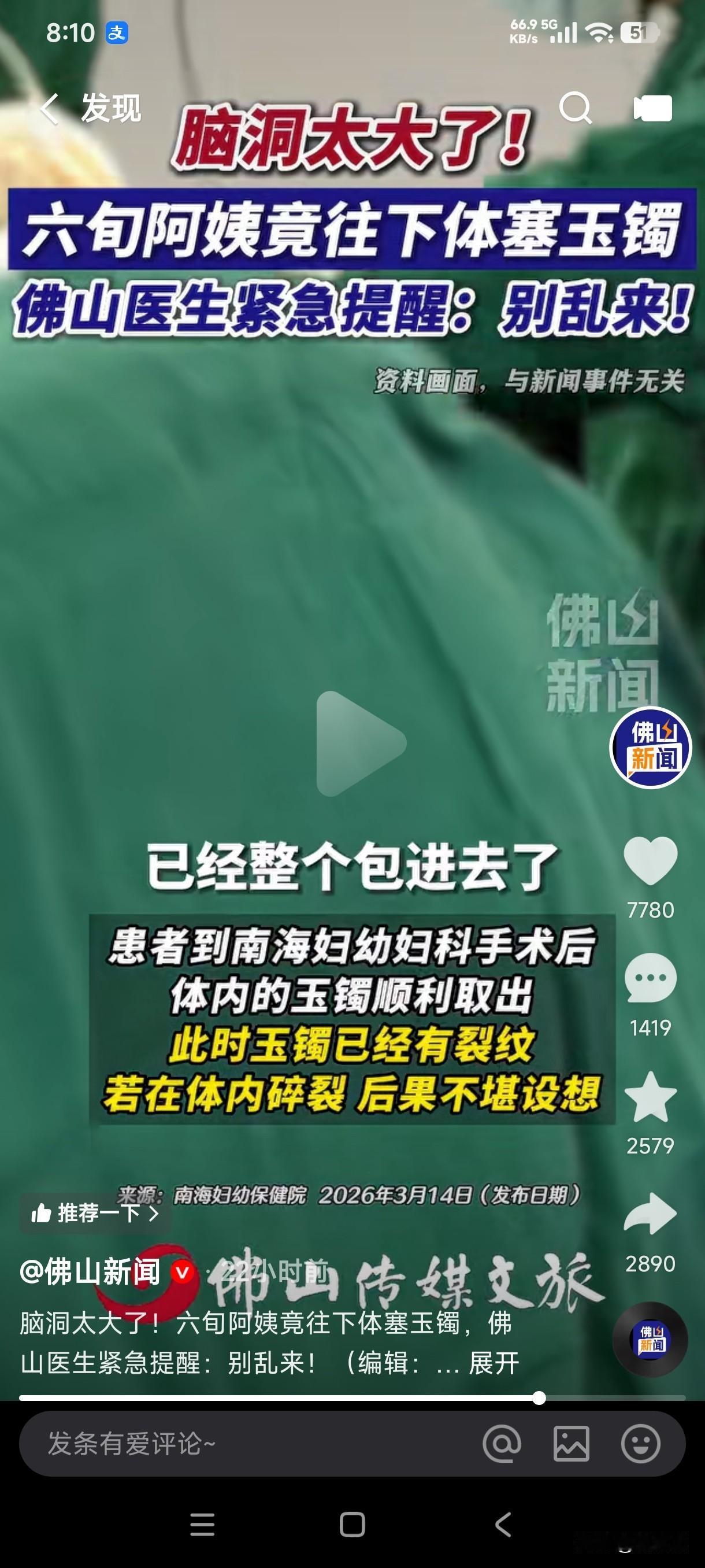 6旬阿姨居然往下体塞玉镯无法取出紧急就医 原来她早年因子宫脱垂放置子宫托,后来觉得要定期清洗子宫托太麻烦,突然发现玉镯和子宫托的形状相似,于是就用玉镯代替了子宫托,结果由于放进去的时间太久,导致玉镯无法从下体取出,随即就医寻求医生的帮助,医生通过手术顺利将体内的玉镯取出,取出后发现玉镯已经出现了裂痕,如果在耽误的时间长点,玉镯一旦在体内破碎,那后果真的不堪设想。 这阿姨也是个狠人,居然敢用玉镯代替子宫托,这得亏手腕上戴的是玉镯,如果手腕上戴的是大金镯子,她是不是就用大金镯子代替子宫托了?
