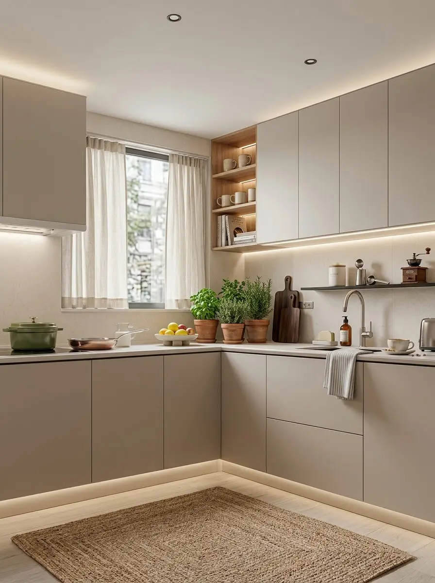 厨卫空间同样将专业设计感发挥到极致。厨房L型动线流畅,木质开放格与内嵌灯带点缀其间,兼具烟火气与高级感 🍳;卫生间则利用微水泥质感与悬浮式木质洗漱台,搭配圆形的氛围灯镜,将空间的艺术气息与品质感瞬间拉满 🛁。舍弃繁杂,回归纯粹,这就是理想中舒适又高级的质感生活 🌿。
