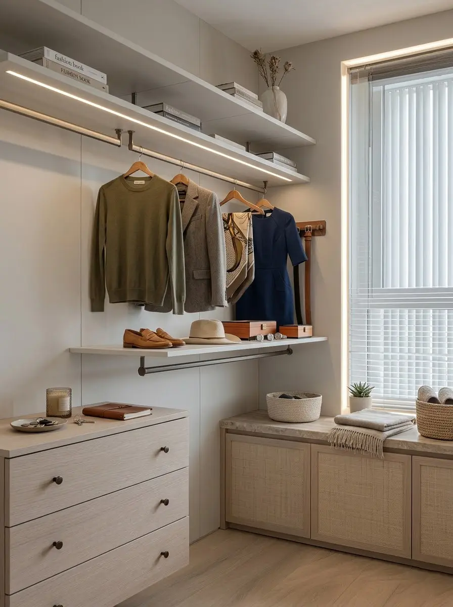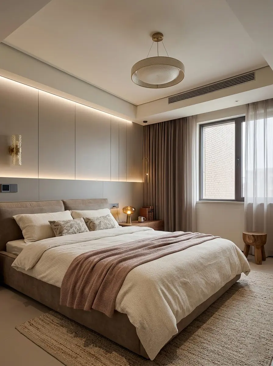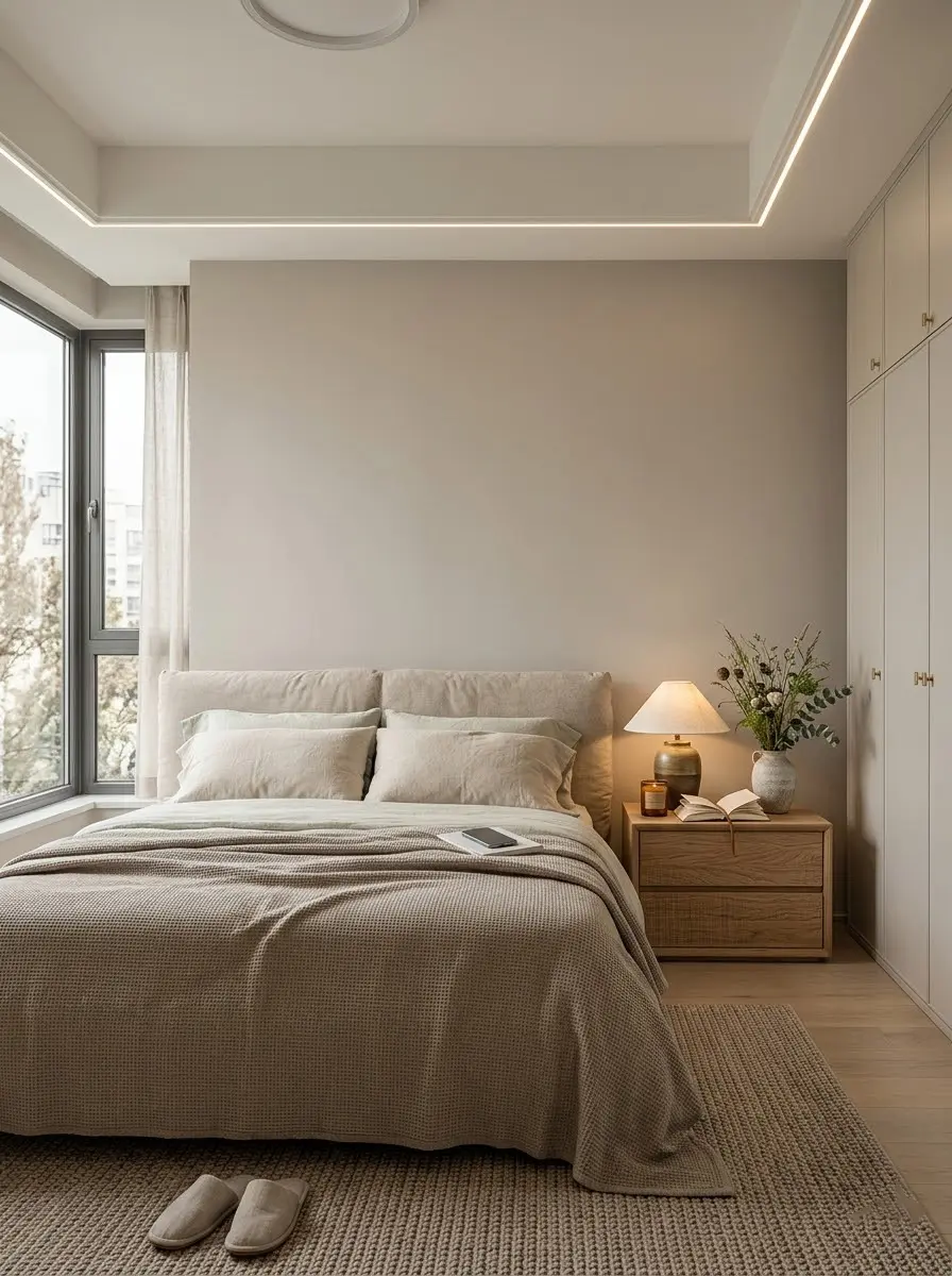 移步私密休息区,卧室延续了低饱和度的高级配色 🛏️。棉麻质感的床品与利落的背景墙护墙板完美融合,营造出极具包裹感的舒压睡眠氛围。步入式衣帽间兼顾了空间美学与实用性,悬浮挂衣区与藤编地柜的碰撞,让日常收纳也成为一种视觉享受 👔。