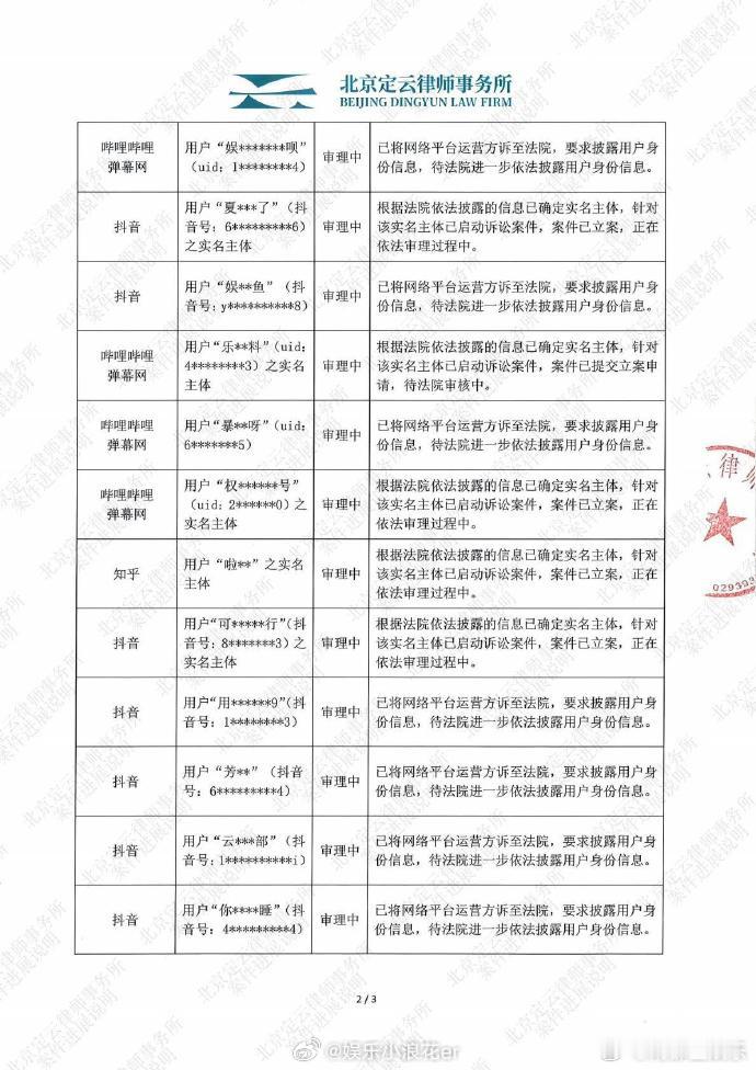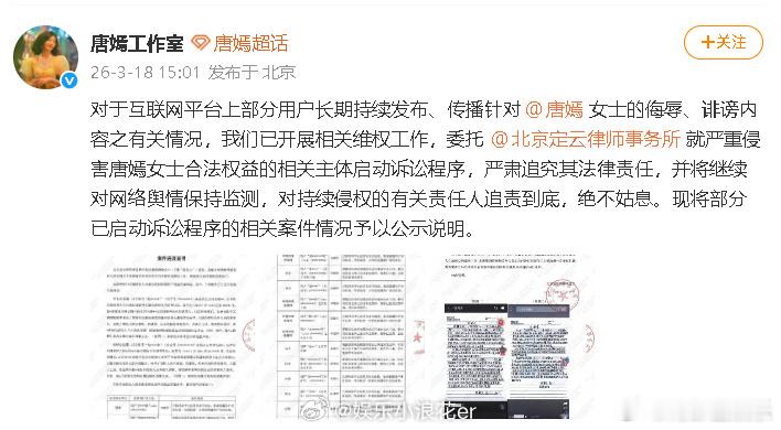 唐嫣工作室晒造谣网友道歉信唐嫣工作室公开案件进展说明今日,唐嫣工作室公开案件进展说明:“对于互联网平台上部分用户长期持续发布、传播针对女士的侮辱、诽谤内容之有关情况,我们已开展相关维权工作,委托北京定云律师事务所就严重侵害唐嫣女士合法权益的相关主体启动诉讼程序,严肃追究其法律责任,并将继续对网络舆情保持监测,对持续侵权的有关责任人追责到底,绝不姑息。现将部分已启动诉讼程序的相关案件情况予以公示说明。”