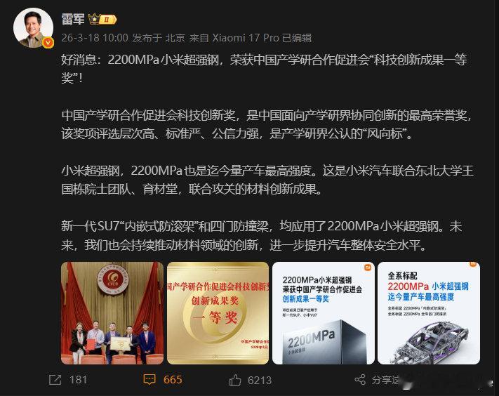 雷军回应小米超强钢争议小米超强钢获得国家级科技一等奖又又又拿了一等奖,这含金量谁