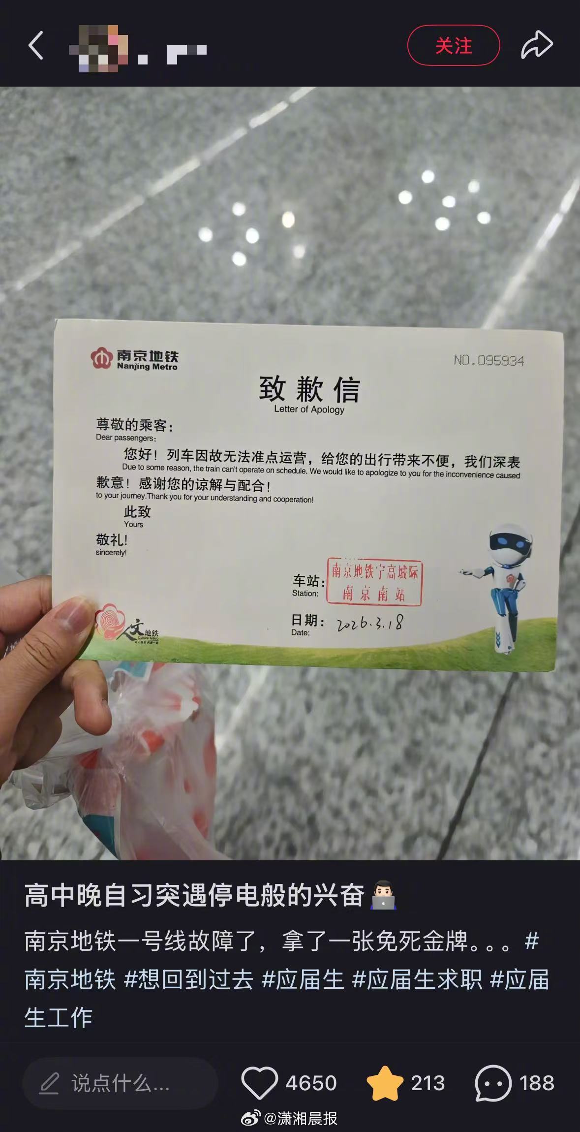 【最牛请假条!#南京地铁故障发致歉信可作迟到证明#】#官方回应南京地铁故障后发迟到证明#3月18日早晨,有网友发视频称南京地铁1号线发生故障,有乘客从铁轨上步行下站,还有大量网友发帖表示,由于地铁故障,自己上班要迟到。