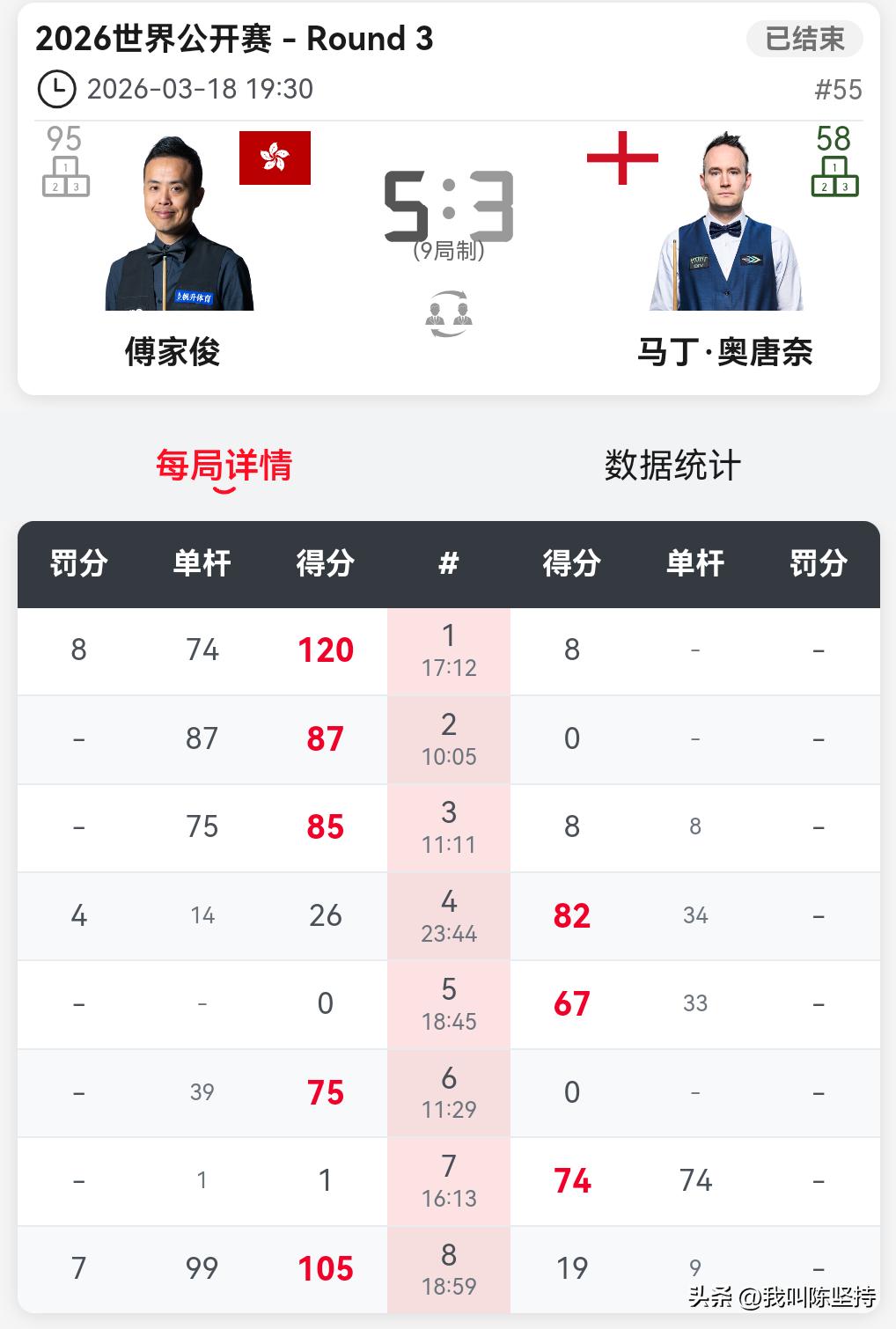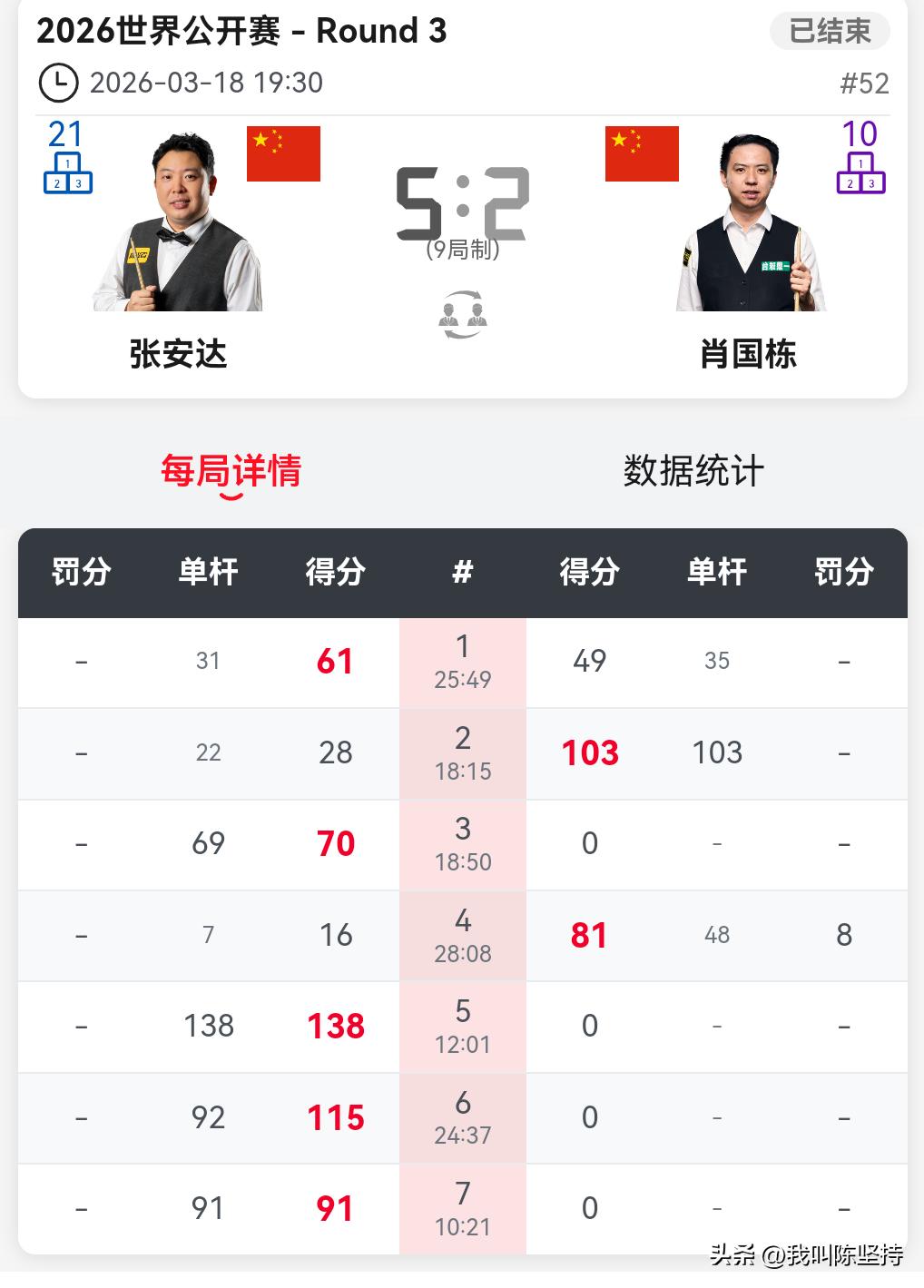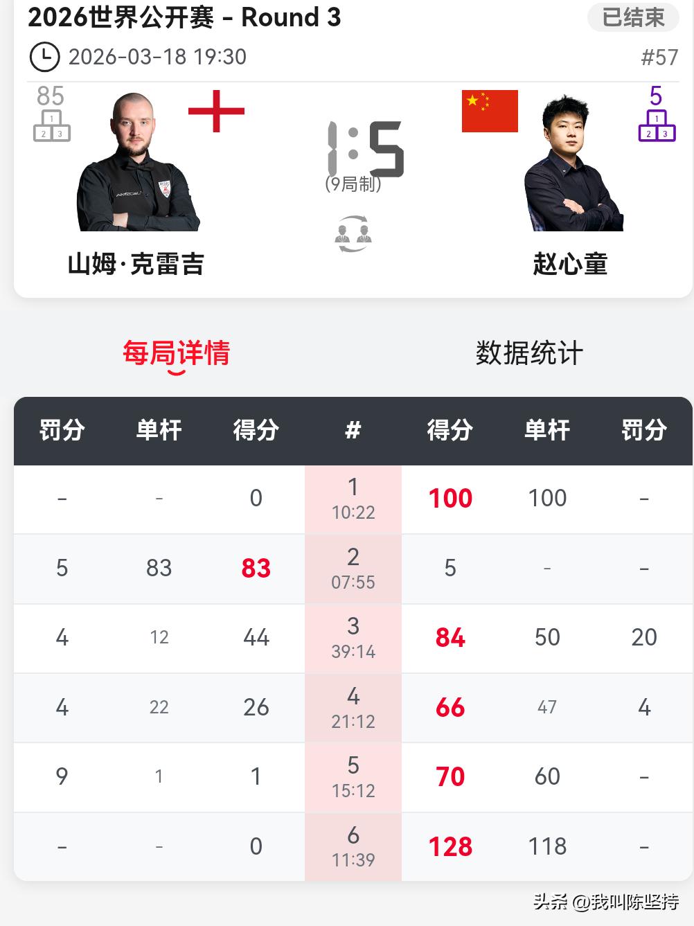 因为热爱,所以坚持!赵心童5-1战胜克雷吉,晋级玉山公开赛16强。 在战胜克雷吉之后,赵心童说,无论顺境还是逆境,斯诺克永远陪伴着自己。在以后人生的道路上,自己也会陪伴斯诺克,这就是一种热爱吧! 虽然大比分战胜了克雷吉,但是并不轻松。克雷吉防守不错,而赵心童一度手感不好,准度欠佳,但是凭借高质量的斯诺克,赵心童最终战胜了克雷吉。 肖国栋2-5不敌张安达,单赛季排名13,失去了参加巡回锦标赛的资格,除非奥沙利文退赛。目测奥沙利文现在手感火热,估计会趁热打铁,不会轻易退赛。当然,如果张安达打进决赛,也能获得巡回锦标赛的资格。 傅家俊老当益壮,5-3击败磨王奥唐纳,傅家俊手感不错。 ⏰3月19日(周四)【16进8轮次,9局5胜制】 14:00 周跃龙 vs 马克·艾伦 14:00 吴宜泽 vs 凯伦·威尔逊 14:00 罗尼·奥沙利文 vs 肖恩·墨菲 14:00 瑞恩·戴 vs 阿尔特米·齐津斯 19:30 傅家俊 vs 塔猜亚·乌努 19:30 加里·威尔逊 vs 赵心童 19:30 贾德·特鲁姆普 vs 罗比·威廉姆斯/丹尼尔·威尔斯 19:30 张安达 vs 侯赛因·瓦菲