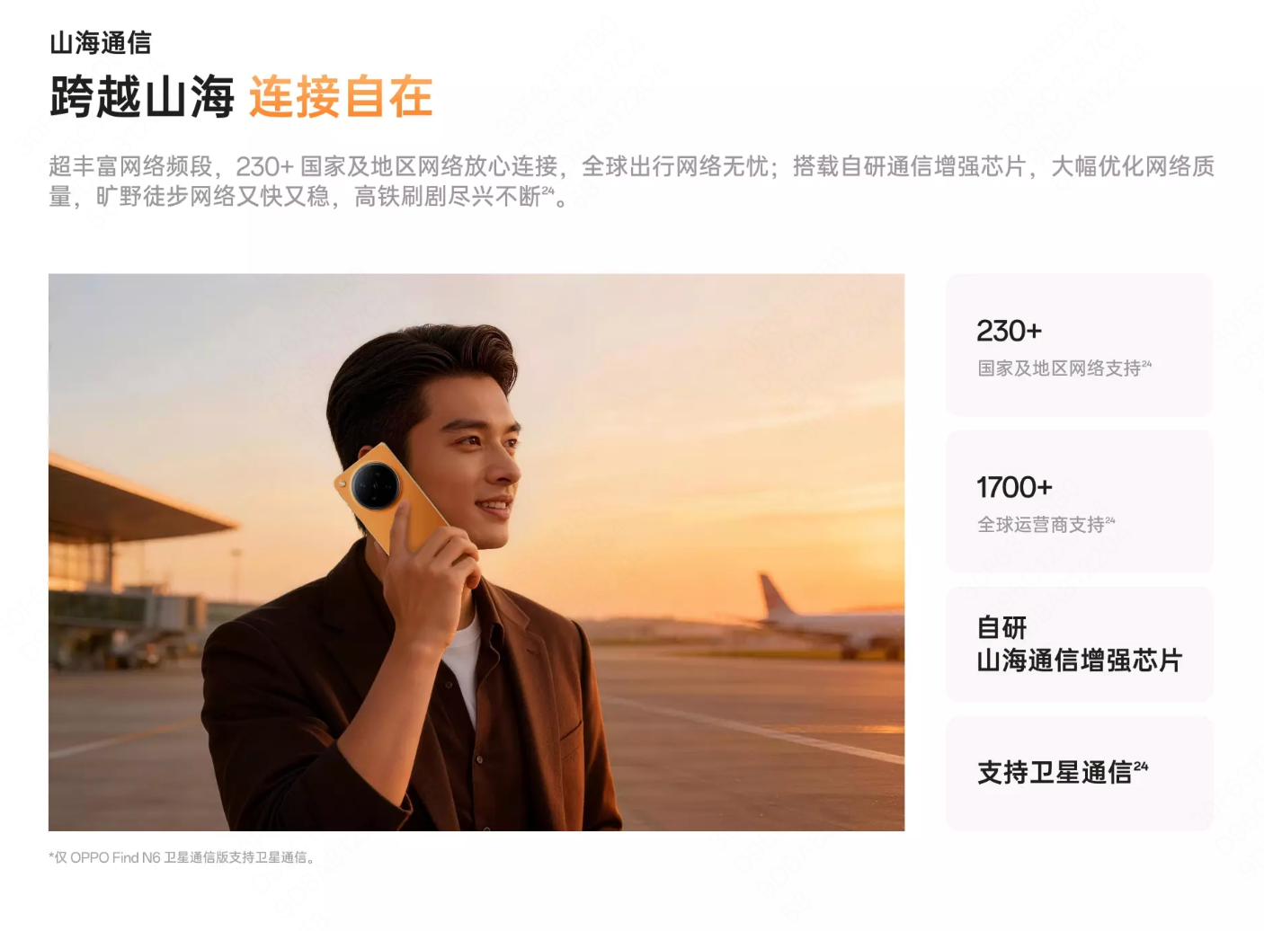 通信能力方面,OPPOFindN6搭载自研山海通信增强芯片,配合多重通信增强技术,核心频段信号强度提升100%,支持66个通信频段,覆盖全球230多个国家和地区,是目前全球支持网络频段最多的折叠屏手机,真正实现“走遍全球,一部N6就够了”。