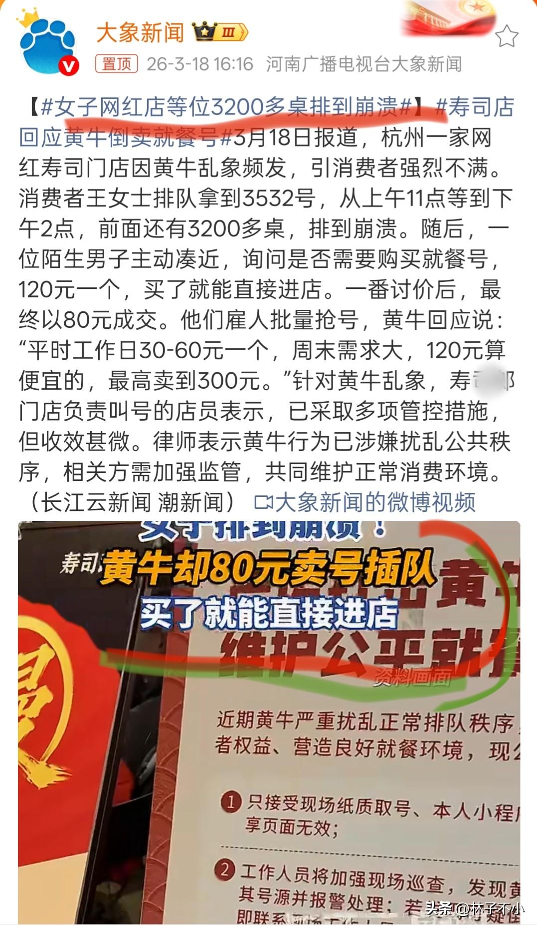 荒唐,荒唐,绝对的荒唐! 仅仅为了吃一顿饭,排队居然能排到3532号,如果不是权威媒体的报道你敢信吗? 就算媒体报道,我觉得这仍是一件荒唐至极的事情。 我先来简单说一下事情的基本情况,再来说说这件事究竟有多么荒唐! 3月18日,据大象新闻媒体报道,杭州有一家特别火的寿司店,也就是我们说的网红店。 有网友从上午11点就开始排队,当时拿到的号码是3532号,也就是说她前面有3531个号,至于实际排队的有多少人这就不得而知了。 当网友排到下午2点的时候,被告知前面还有3200个号在排队,如果按照这个节奏排下去,当天肯定是吃不上了。 问题来了,真的会有这么多人在排队吗?答案肯定不会的。 有黄牛告诉网友只要花费120元买个号,立马就能进去,最后该网友经过讨价还价最终以80元的价格达成交易。 此外,黄牛称,工作日的时候,一个号能卖到30到60元,周末的时候最高能卖到300元。 对此,商家回应,想了很多办法,都没有好的办法来治理这种现象。 这就是整个事情的基本情况,接下来重点说说这件事究竟有荒唐。 第一,吃饭虽然是刚需,但可替代的东西太多,好吃的又不是只有一家,真的有必要跟一家店较真吗?我觉得吃饭是刚需,但这家店并不是刚需,根本没必要这么疯狂。 第二,把排队放到三千多个号,这本身就不是一件合理的事情,正常情况下会有三千多人来就餐吗?显然有点夸张。最好的证明就是3个小时一共消耗了300个号,前面的数据已经是最好的答案了。 可是明知不现实,为什么还要这么做呢?这个问题值得深思! 第三,当商家说不太好治理黄牛炒号的事情,我觉得这个多少有点滑稽了。 最好的例子就是火车票,以前没有实名制,自从有了实名制,这个票还需要炒吗?答案显而易见。 办法总比困难多,这句话是有道理的。 这件事难就难在叫不醒一个装睡的人,最为常见的一个现象,人吃饭是喜欢扎堆,越难排就越有人爱凑这个热闹。 综合以上3点,我觉得这件事就是一件荒唐的事情。 我不是对美食有意见,更不是黑哪个美食品牌,但我觉得为了一个寿司真的没有必要浪费这么多的精力,更没必要去花冤枉钱给黄牛增加营收。 对此,大家又是怎么看?