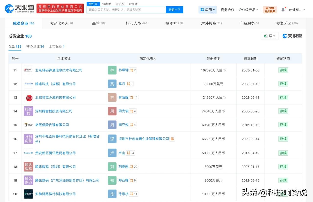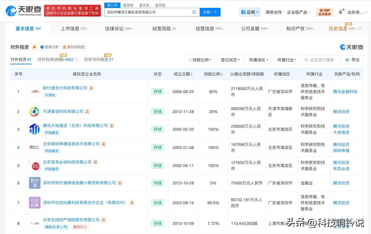 【腾讯商业版图盘点 腾讯旗下公司涉及多个行业】腾讯发布2025年财报 据媒体报道,3月18日,腾讯控股发布2025年第四季度及全年财报,Q4营收1943.7亿元,同比增长13%;全年营收7517.7亿元,同比增长14%。 天眼查工商信息显示,腾讯关联公司深圳市腾讯计算机系统有限公司成立于1998年11月,法定代表人为马化腾,注册资本6500万人民币。股东信息显示,该公司由马化腾、张志东、陈一丹、许晨晔共同持股。对外投资信息显示,该公司直接持股40余家企业,其中30余家为存续状态,包括财付通支付科技有限公司、腾讯大地通途(北京)科技有限公司、北京驿码神通信息技术有限公司、北京英克必成科技有限公司等。 天眼查显示,除上述企业外,腾讯旗下还关联腾讯科技(深圳)有限公司、腾讯云计算(北京)有限责任公司、腾讯影视(深圳)有限公司等,版图涉及科技、金融、传媒等多个行业。 天眼查信息: