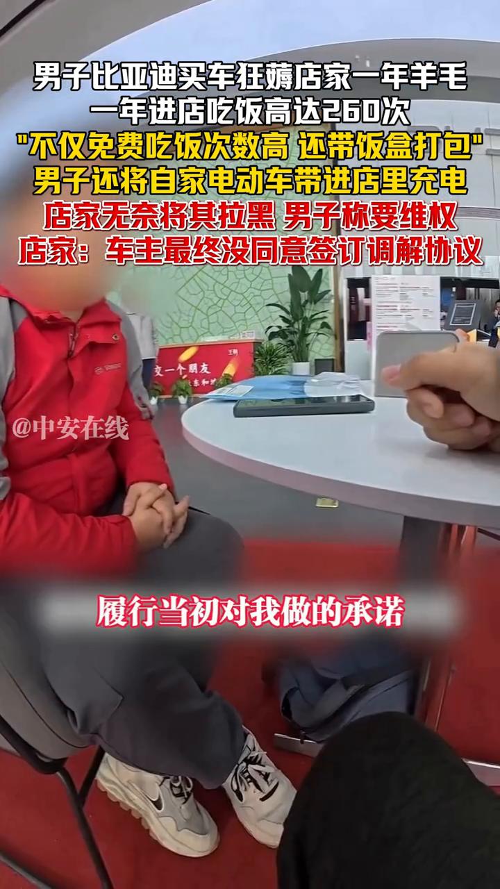 男子比亚迪买车狂薅店家一年羊毛,一年进店吃饭高达260次,不仅免费吃饭次数高还带饭盒打包。男子还将自家电动车带进店里充电,店家无奈将其拉黑,男子称要维权。店家:车主最终没同意签订调解协议。 中安在线。 3月17日,浙江。比亚迪买车,客服承诺免费洗车、充电、吃饭,一个月来个两三次正常。他去年365天应该是超过了260次,吃饭甚至带着饭盒打包带走。他把他自己家里的电动车放在后备箱,放在我,我是用了充电(充电),他们没告诉我不能充。 3月份事情再次升级,他把车停到了交车新车专区。如果是社会车辆停,一开门掉一块漆,客户不买账。我们的员工只是说这地方不是你停车的地方,麻烦你挪个地方。他说狗拿耗子多管闲事。 履行当初对我做的承诺,免费洗车、吃饭、充电,还有四次的纸质保养卡,四次保养卡一张398,全部折现我以后不来了。最终我们的处理方案,口头约定您的维修基金、保险券一次性买断,从此我们门店和你不产生交集。 本来以为调节已经结束了,就在刚刚得到最新消息,车主最后还是没有签订调解协议。