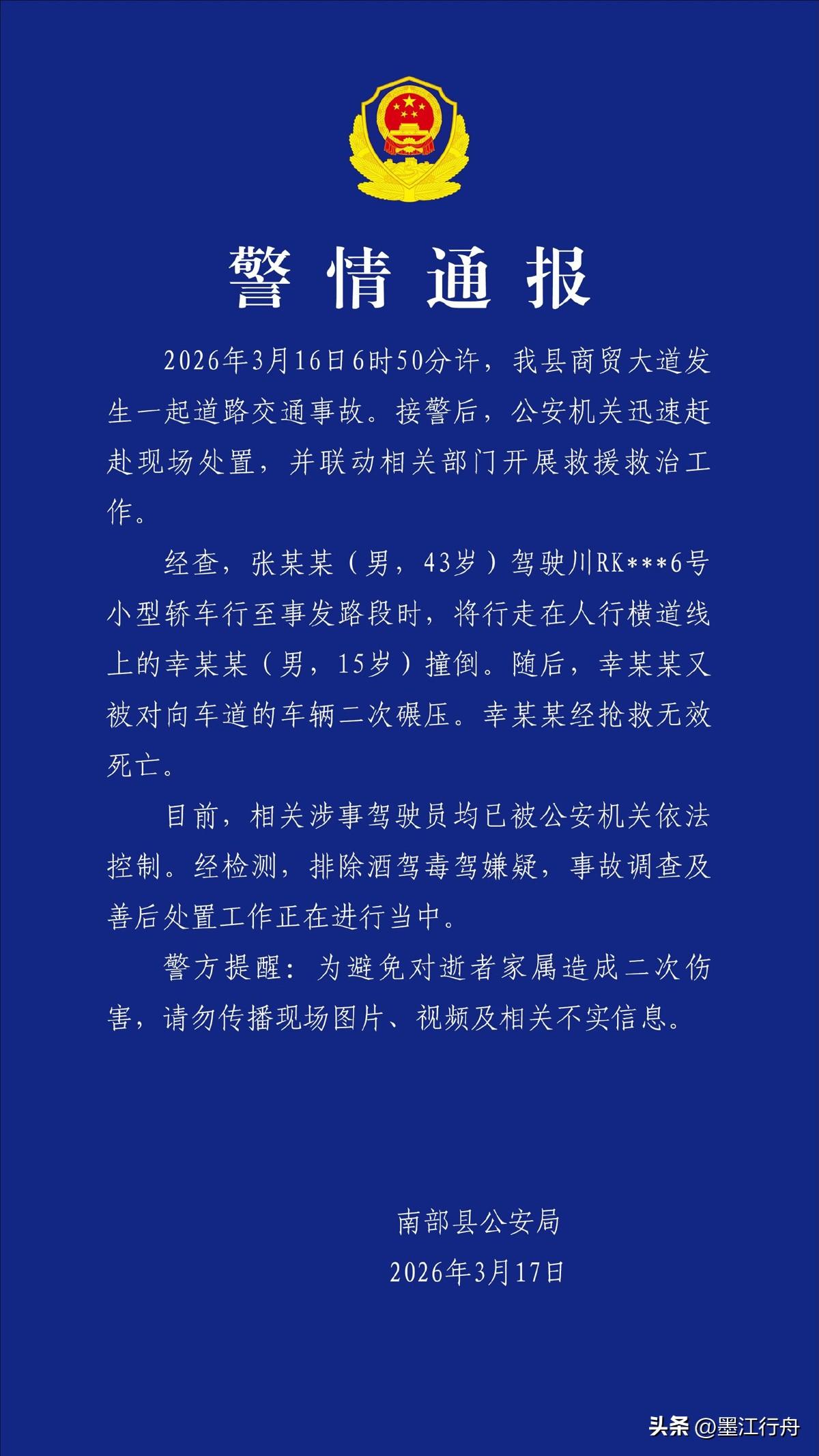 实探“15岁男生过斑马线被撞身亡”现场,警方称正研讨设红绿灯。3月16日清晨6时50分许,四川南充市南部县商贸大道一名15岁中学生在过斑马线时,被一辆轿车撞倒,又被对向来车碾压,致其身亡。 只能说提个建议,中间有隔离,路两边基本不会有人翻越隔离带过路的路段,路灯可以少一些。但是人行道,交通路口,照路面的灯光尽量多一些,把路口和人行道照亮。夜间开车对向车灯亮一些,如果道路照明还不好,根本看不清人行道上的行人。没有灯控的人行横道,真正减速的车很少,特别是有人通行时很多车视而不见还加速冲,应引起交通管理部门重视。 现在许多驾驶员非常没有道德,车辆临近斑马线时不但不减速,反而加速并鸣喇叭强冲而过。遇到雨天还故意高速靠近路边等车辆通过的行人致行人被车轮子溅起来的赃水弄得全身湿透透。所以要在有斑马线的地方安装摄像头治理这些没道德的驾驶员。